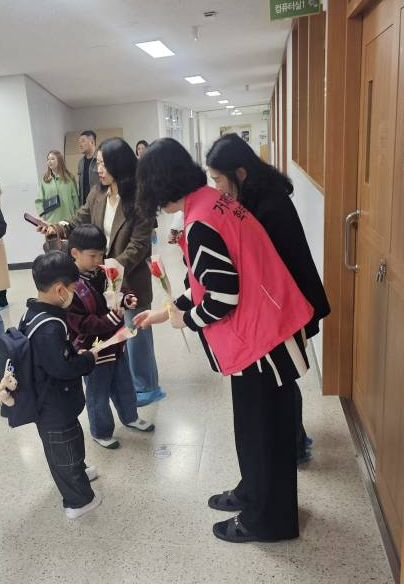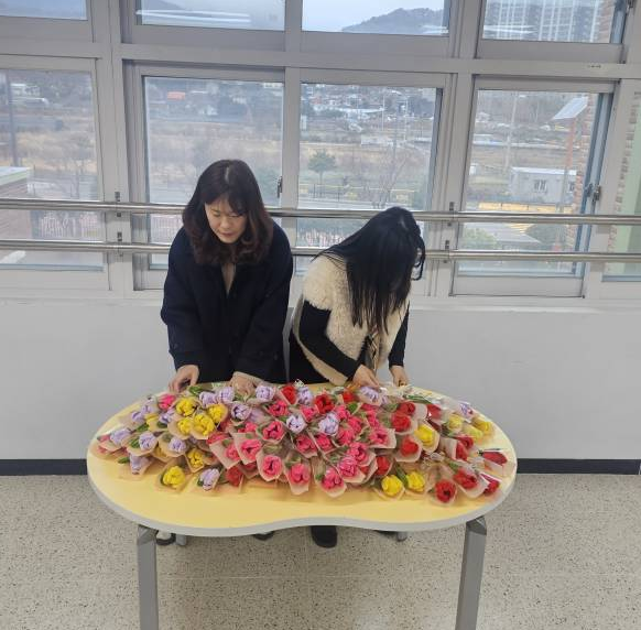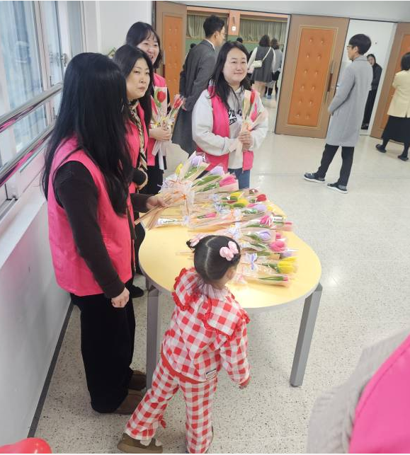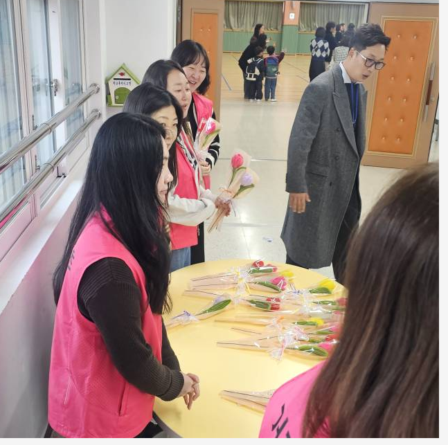 사랑스럽고 귀여운 1학년의 입학을 축하하며 수제 꽃 선물을 전달했습니다.