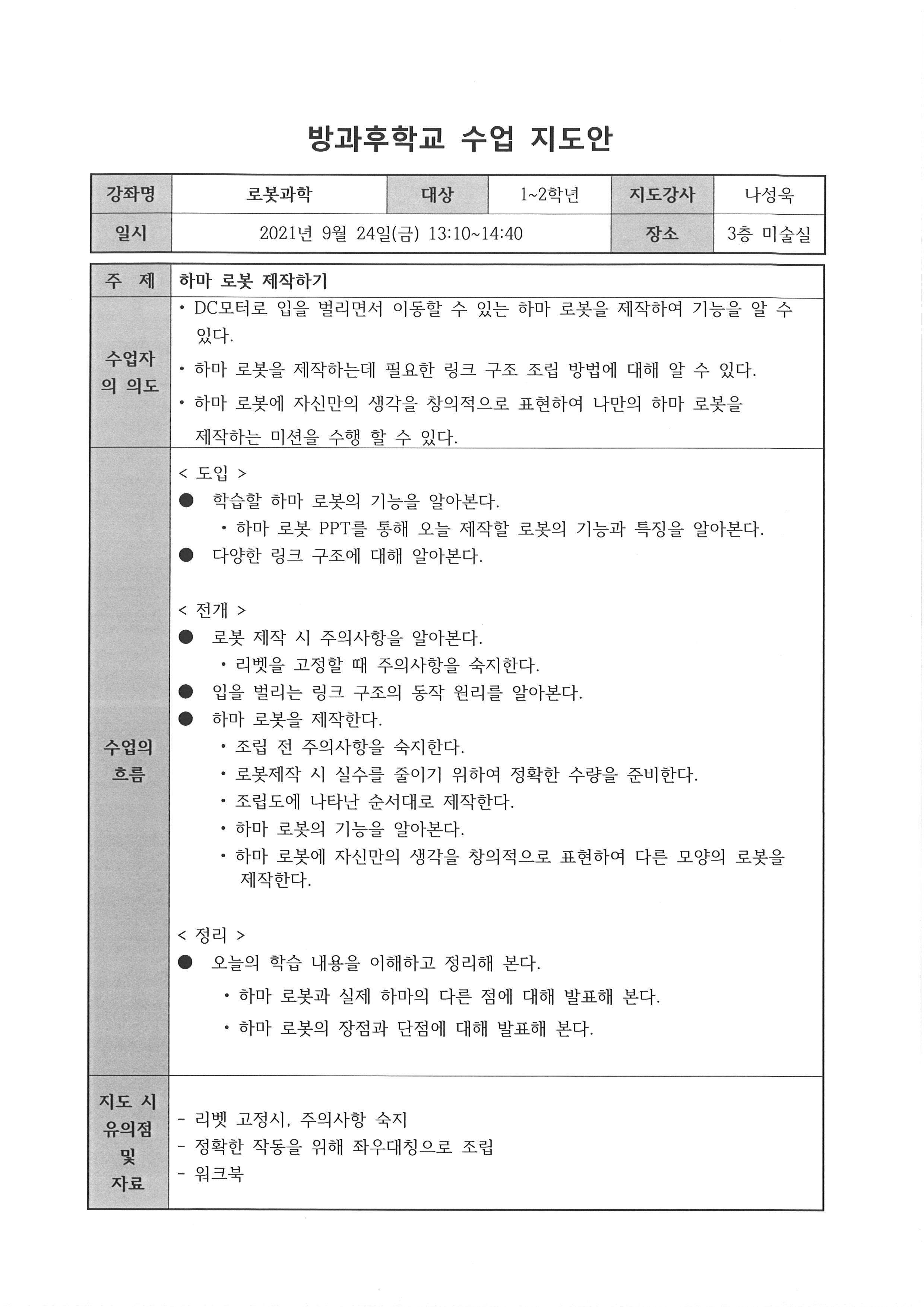 2021학년도 9월 로봇과학 프로그램 활동일지