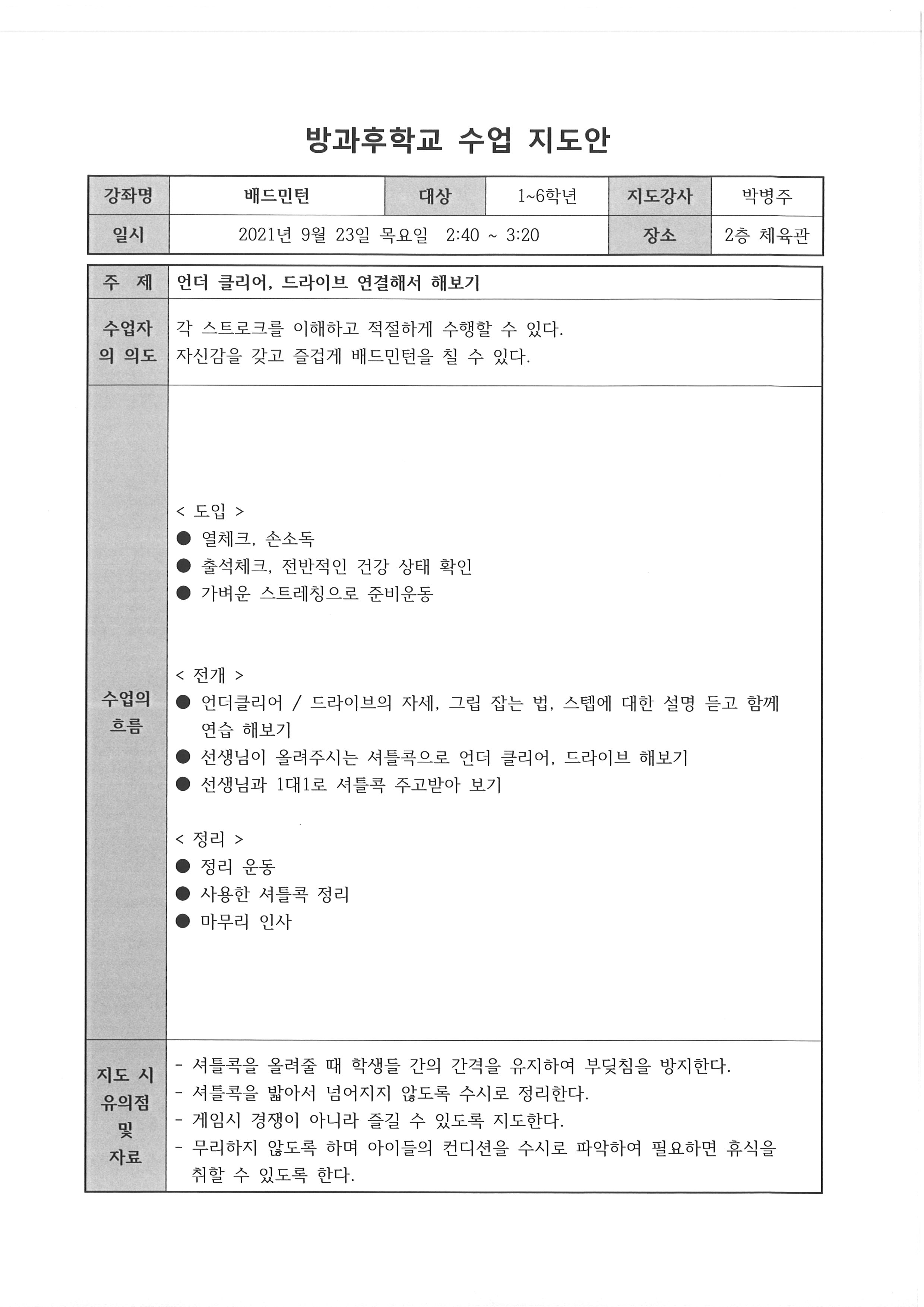 2021학년도 9월 배드민턴 프로그램 활동일지