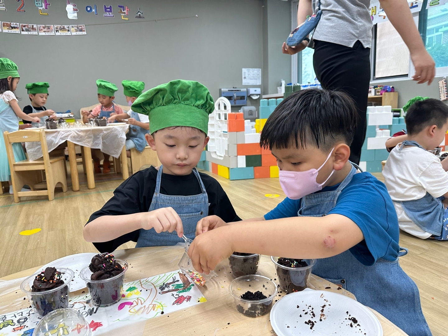 충분히 재료들을 탐색해 본 뒤에 초코머핀 중앙을 어린이 안전칼로 썰어주었습니다! 초코머핀 중앙과 위에 초콜릿을 짜주고 스프링클과 똥모양 초콜릿을 올려 장식해 주면 완성입니다~!! 아이들과 함께 초코머핀을 먹으며 달콤한 시간 보내시길 바랍니다~^^