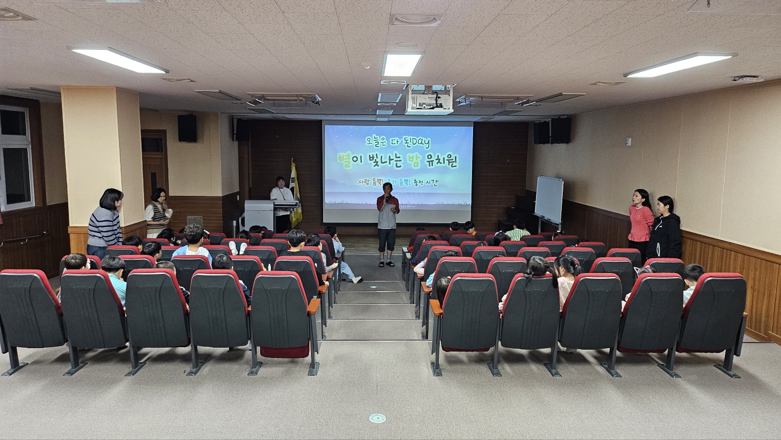 10월 6일 '오늘은 다 된Day' 별이 빛나는 밤 유치원 행사를 하였습니다. 1부 놀이에서는 달고나 만들기, 장난감 파티, 신나는 에어바운스 놀이를 하였습니다. 2부 놀이에서 친구들과 맛있는 저녁식사를 하고 파자마 패션쇼와 양정 노래자랑 그리고 야광파티를 하였습니다! 3부 놀이에서는 부모님의 사랑이 듬뿍 담긴 영상편지와 편지를 낭독하는 시간을 가졌습니다~ 늦은 저녁 시간까지 부모님 없이 유치원에서 친구들과 함께 놀이하는 특별한 시간이였습니다^^