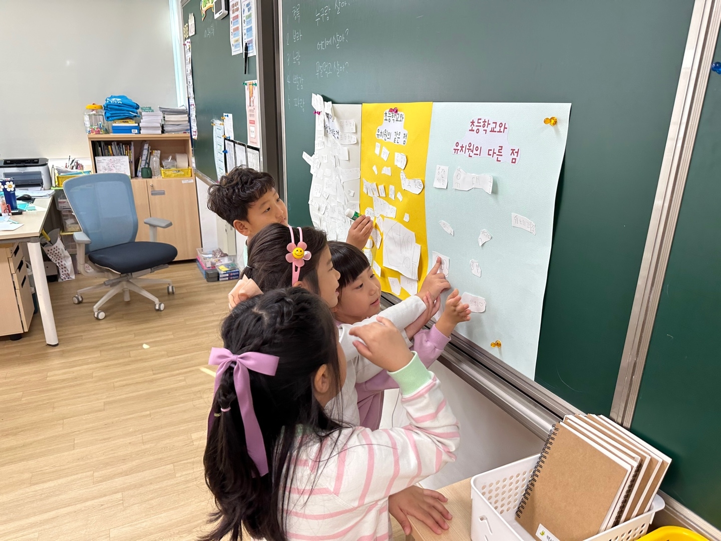 가장 먼저 교실에 도착해서는 각자 앉을 자리도 정해보고 1학년 교실과 특별실을 둘러보는 시간도 가졌어요! 컴퓨터실, 강당, 돌봄교실까지 초등학교에 있는 다양한 공간을 보며 “컴퓨터실에서 코딩 수업을 빨리 해보고싶어요!”라며 초등학교 생활에 대한 기대감을 표현하는 친구들도 있었답니다~! 또 초등학교와 유치원의 공통점과 차이점에 대해 생각을 모아보는 시간도 가져보았어요! 각자 책상에 앉아 활동에 집중하는 모습이 너무 멋지죠~?