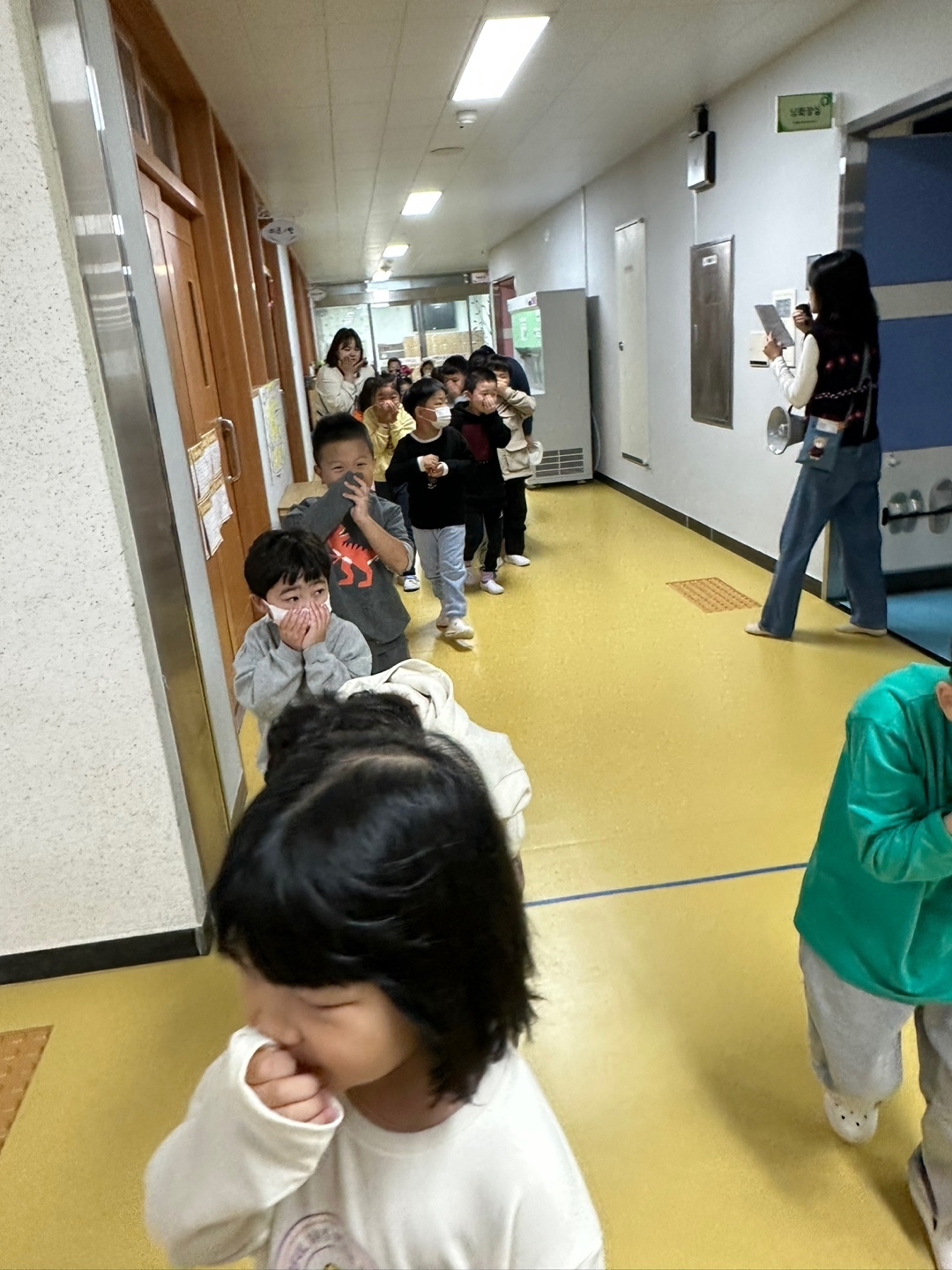 화재경보 및 대피 방송을 듣고 안전하게 대피하는 훈련을 하였습니다.