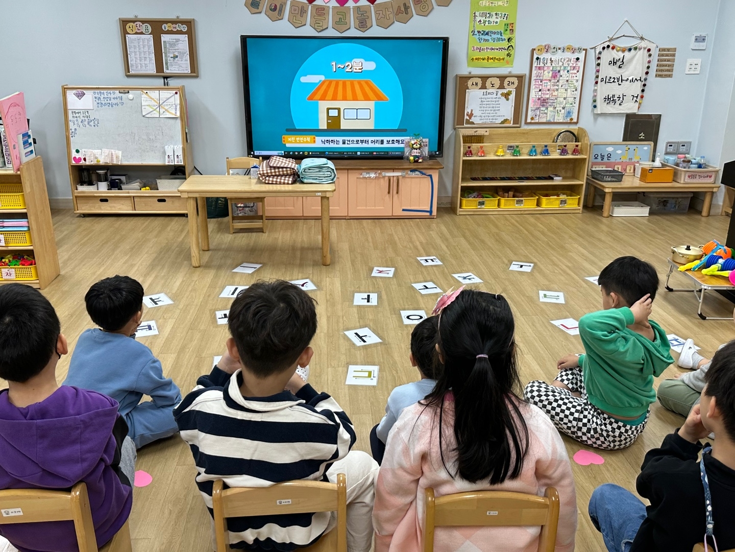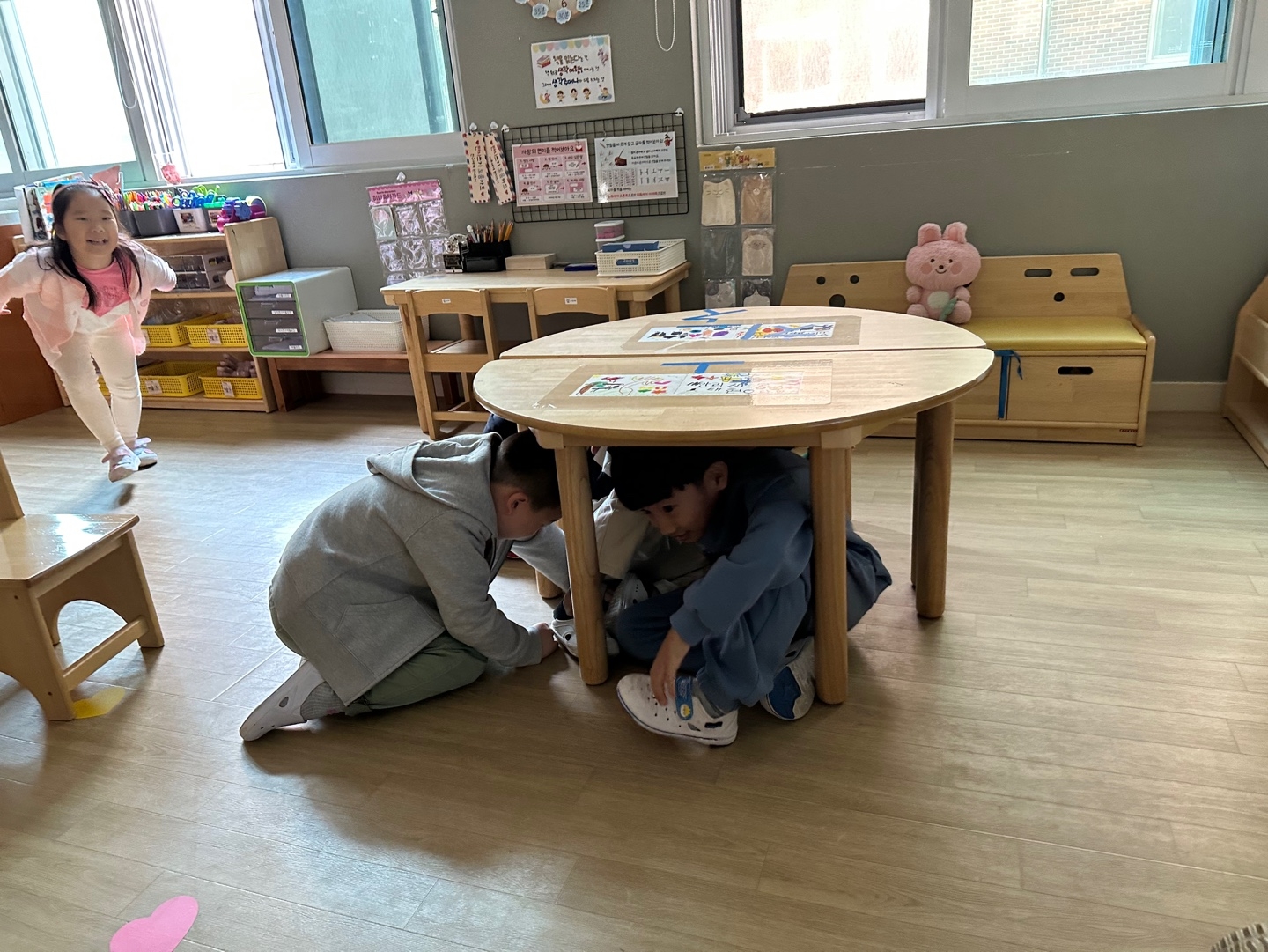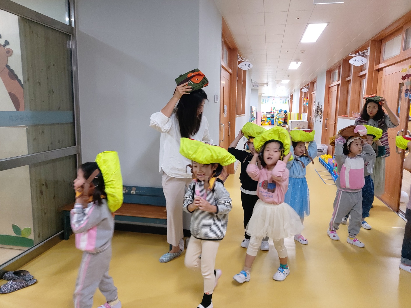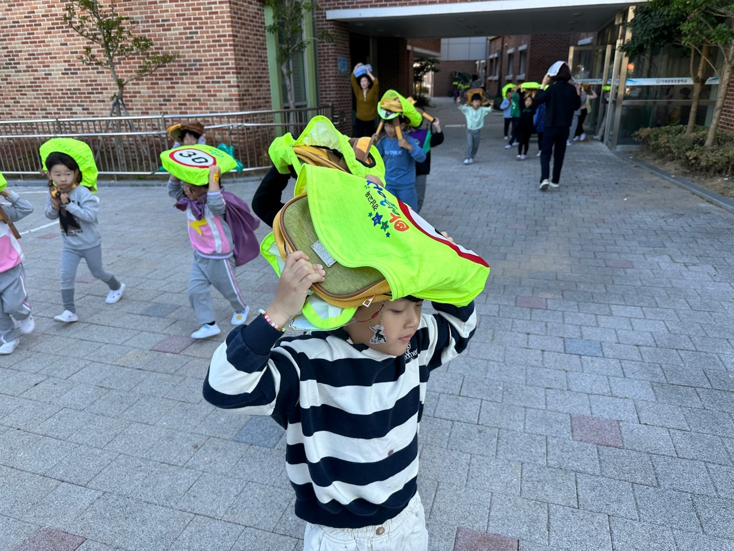 지진 대피 사전교육을 하고 지진경보발령 사이렌 및 방송을 들으며 책상 등 아래에 몸을 숨기고 가방등으로 머리를 보호하여 대피경로를 따라 신속하게 운동장으로 대피를 하였습니다.