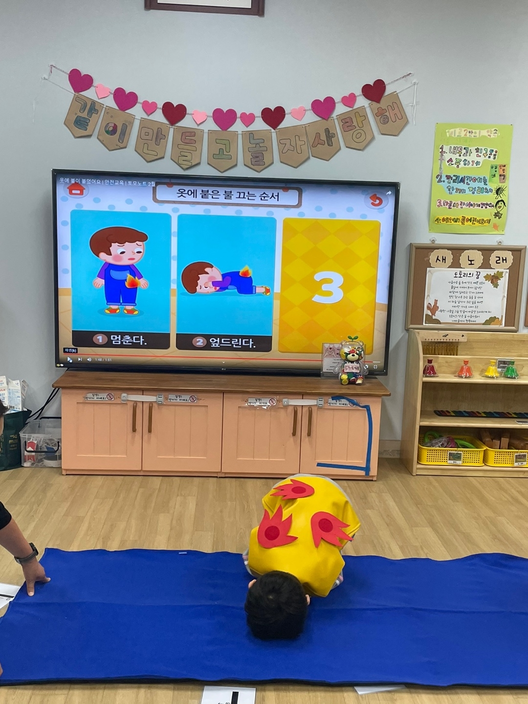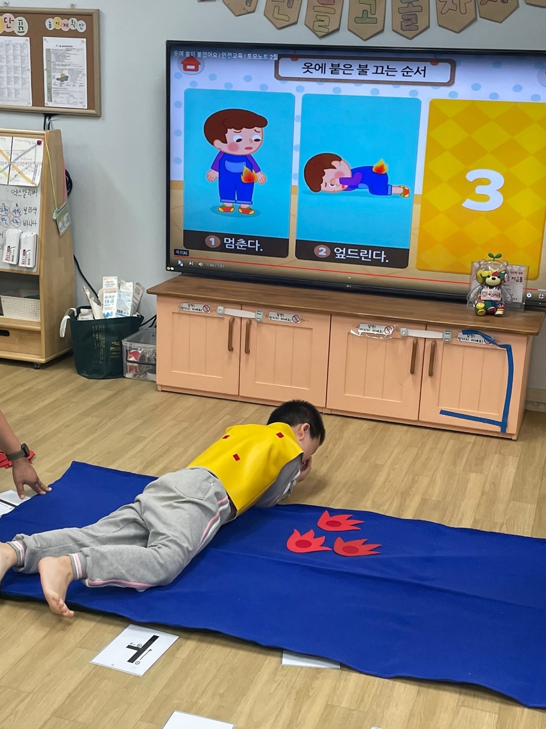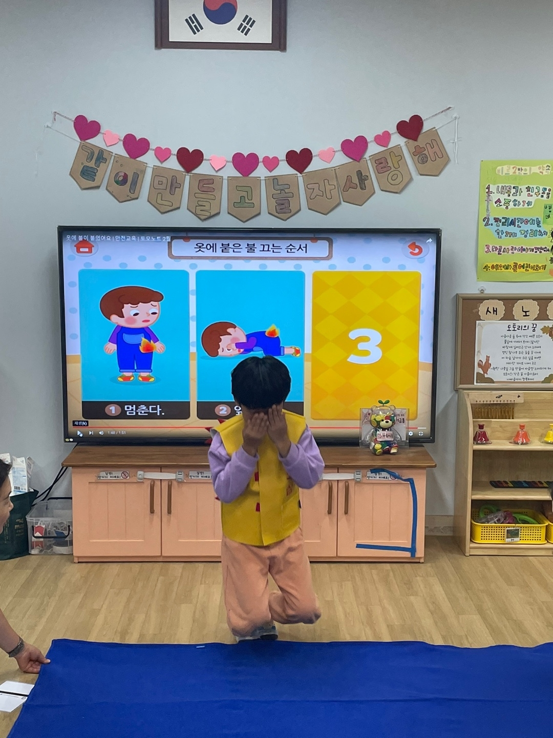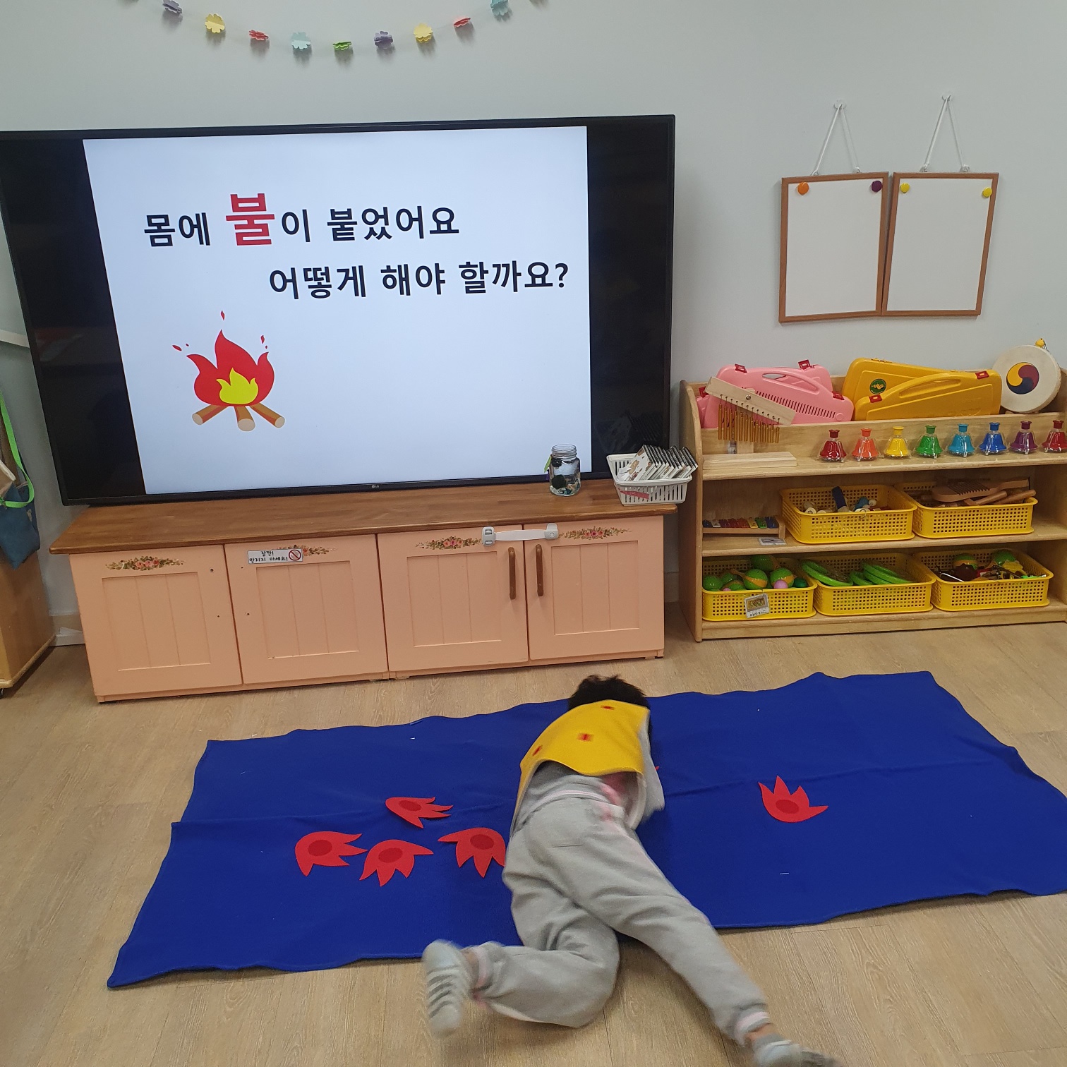 몸에 불이 붙었을 때 어떻게 해야 하는지 대응법에 대해 아이들과 이야기를 나누고