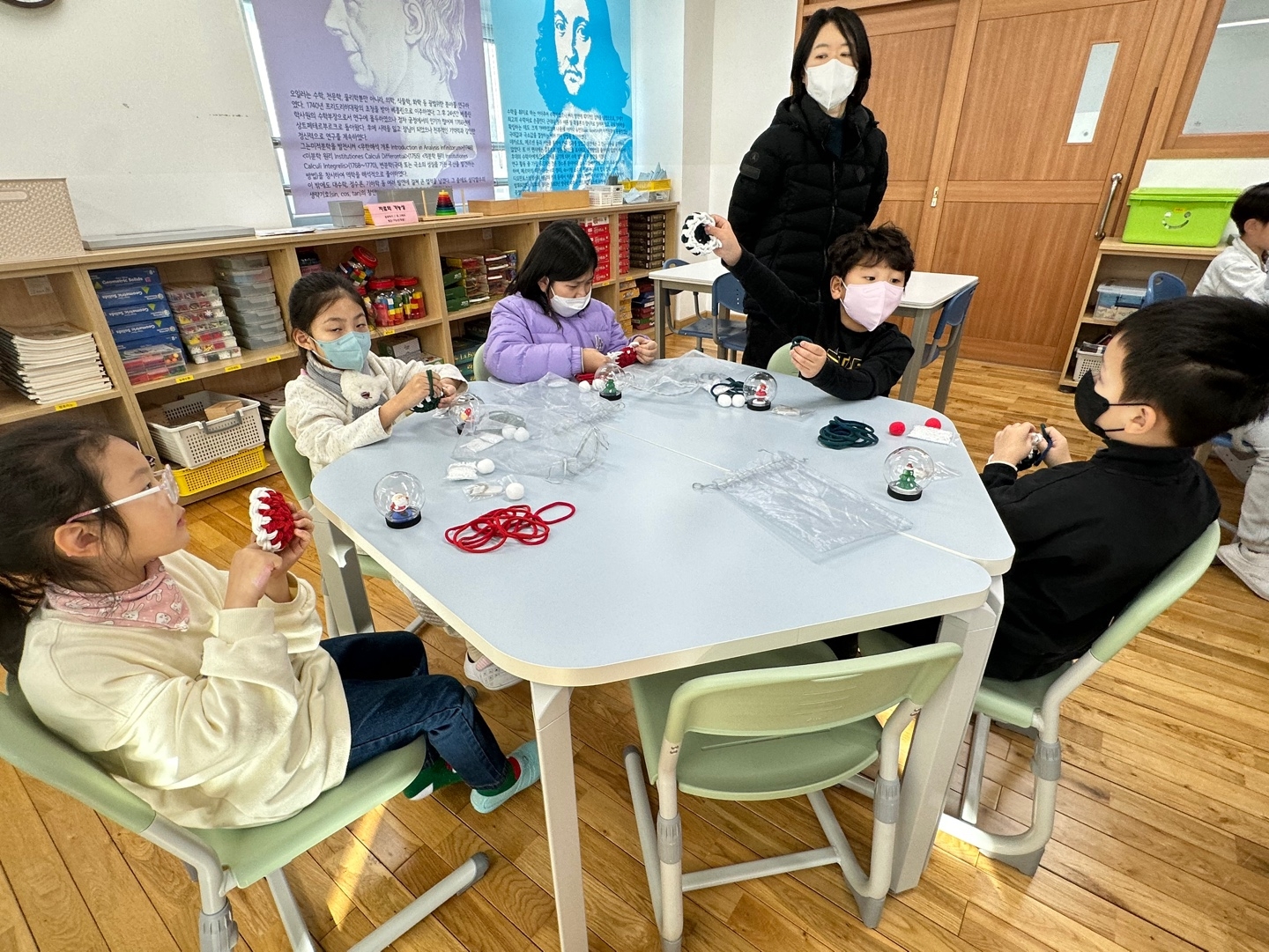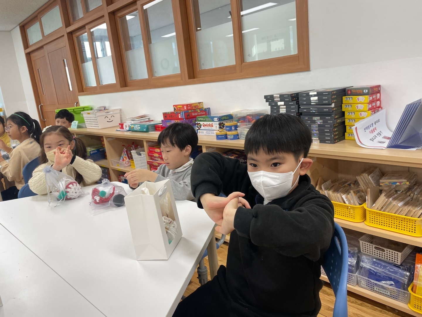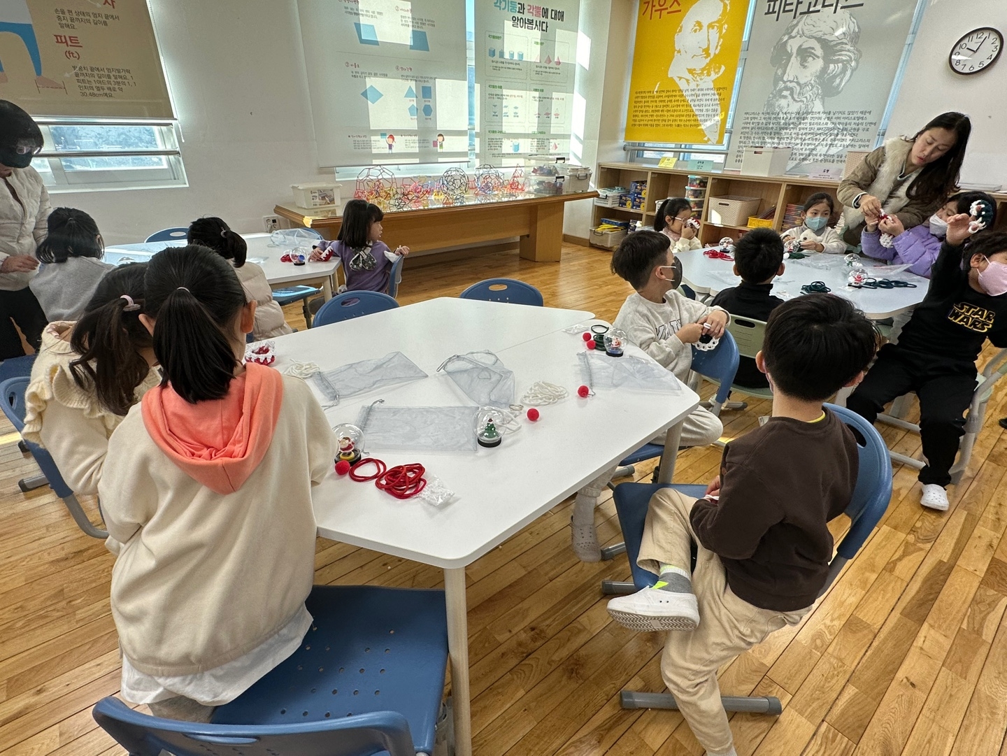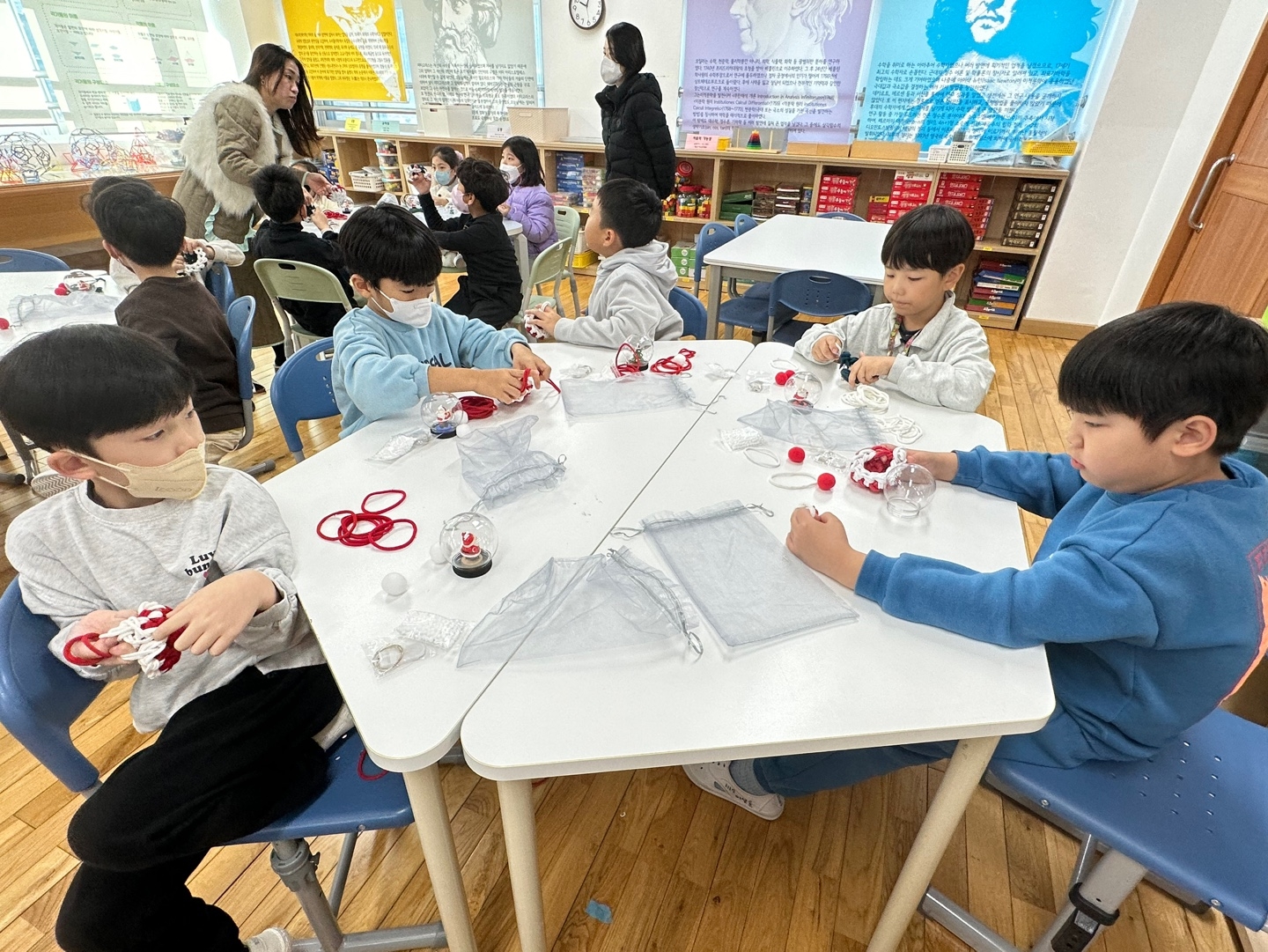 12월 13일 오늘은 1학년과 함께하는 유초이음 어울림DAY! 오늘은 초등학교 수학체험실이라는 특별실에서 1학년 1반, 7반 형님들과 함께 양말목 크리스마스 무드등 만들기 활동을 해보았어요! 미르1반, 2반 친구들이 11월부터 관심을 가지고 놀이하고 있는 ‘양말목’을 형님들에게도 소개해주고 함께 무드등 만들기를 해보았답니다! 양말목은 발등과 발끝을 연결하는 양말의 한 부분으로 양말의 생산과정에서 만들어지는 산업폐기물이에요! 버려지는 자투리들을 모아 새로운 가치를 가진 다양한 공예 작품들을 만들기 시작하며 양말목이 다양하게 활용되기 시작했답니다! 특히 양말목의 가장 큰 매력은 양손만 있다면 다른 재료나 도구 없이도 무궁무진하게 다양한 작품들을 만들 수 있다는 점이에요~!*^^* 같은 모둠이 된 형님들과 자연스럽게 소통하며 서로 도움을 주고 받기도 하고 도란도란 이야기도 나누며 즐거운 시간을 보냈어요! 오늘 아이들이 만들어 간 예쁜 무드등과 함께 미리 크리스마스~!*^^*