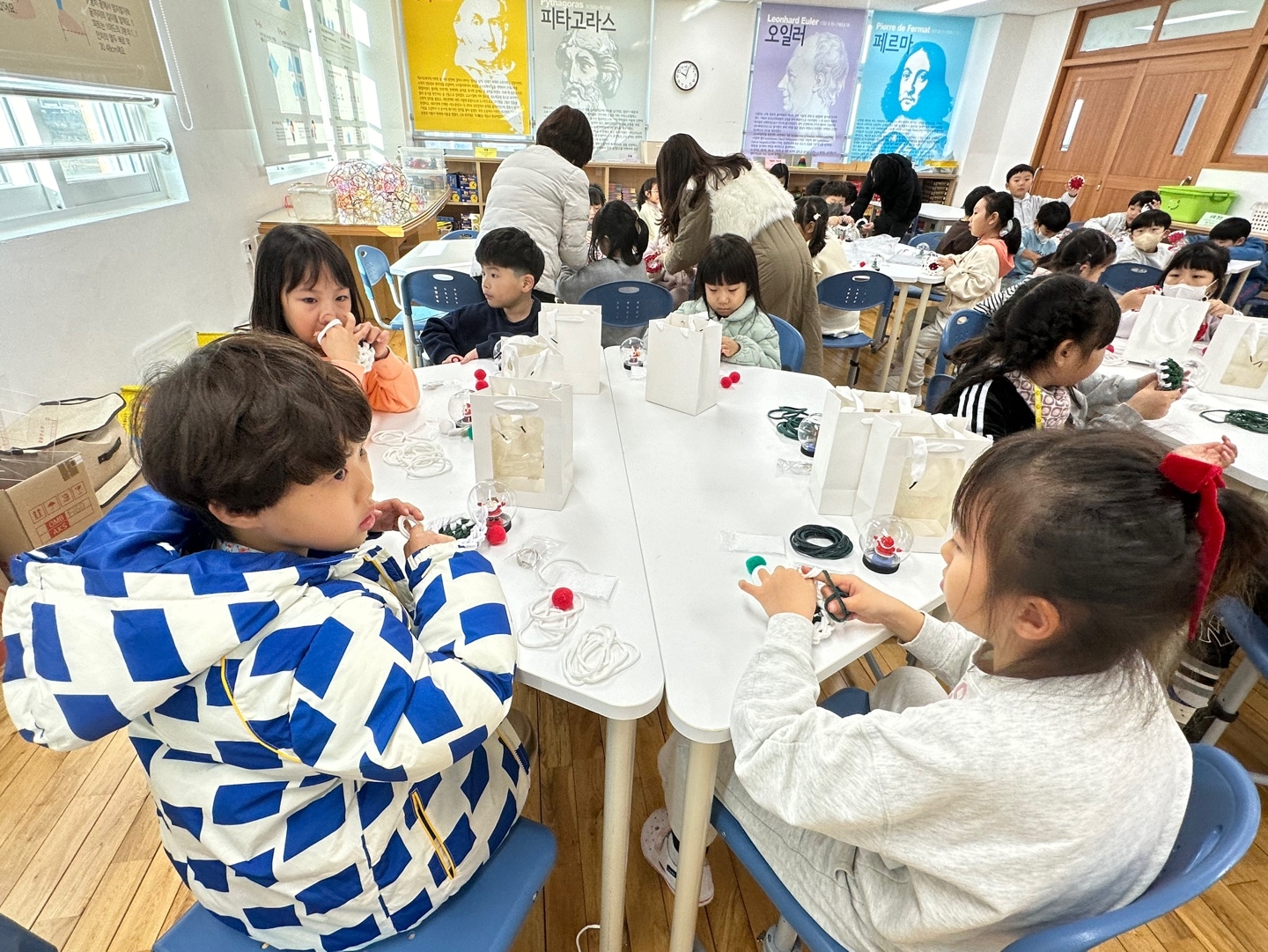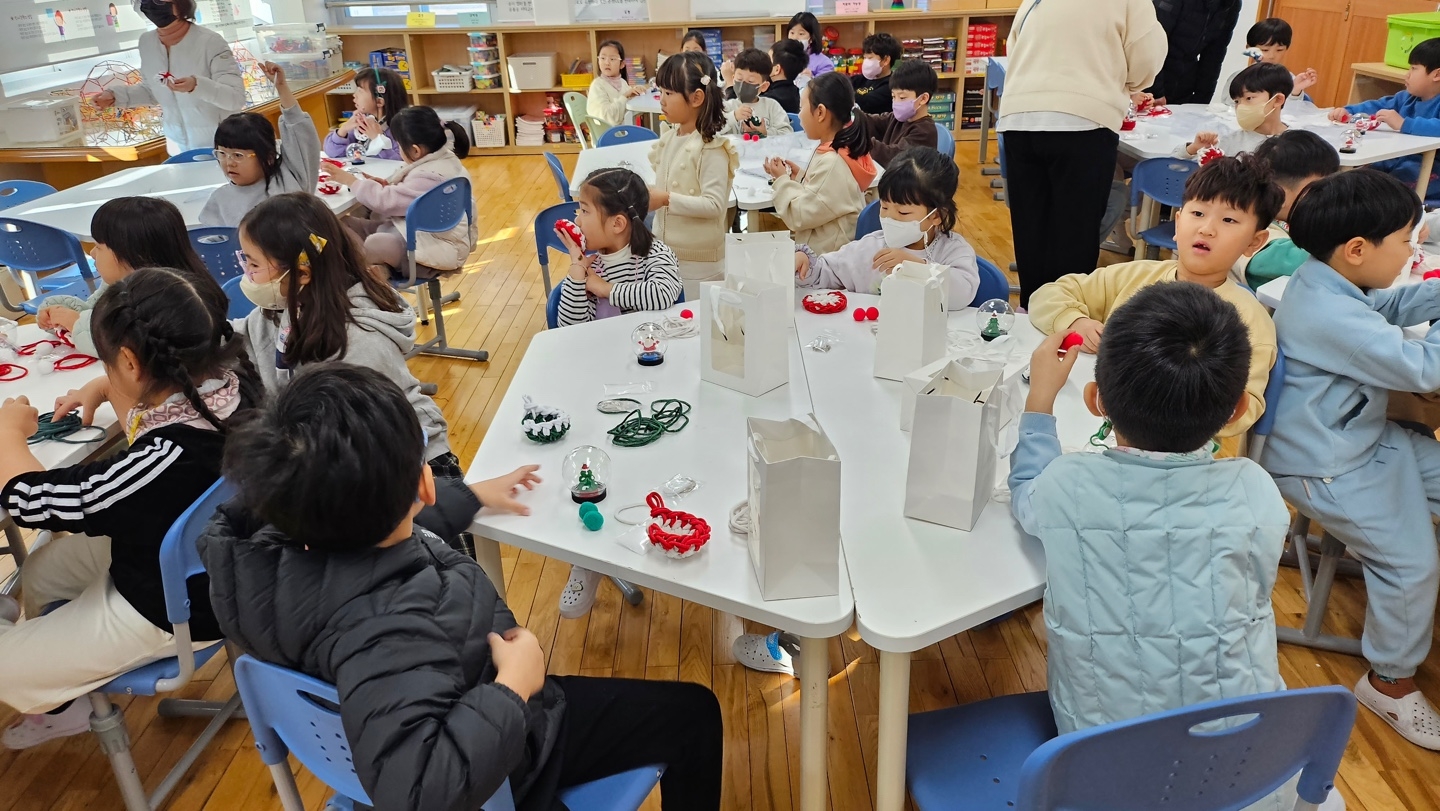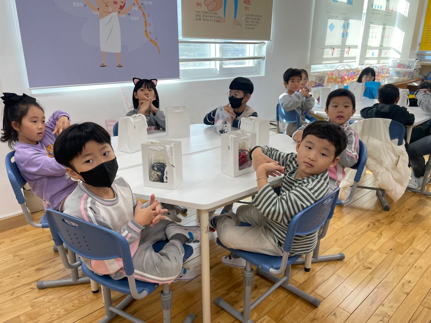 12월 13일 오늘은 1학년과 함께하는 유초이음 어울림DAY! 오늘은 초등학교 수학체험실이라는 특별실에서 1학년 1반, 7반 형님들과 함께 양말목 크리스마스 무드등 만들기 활동을 해보았어요! 미르1반, 2반 친구들이 11월부터 관심을 가지고 놀이하고 있는 ‘양말목’을 형님들에게도 소개해주고 함께 무드등 만들기를 해보았답니다! 양말목은 발등과 발끝을 연결하는 양말의 한 부분으로 양말의 생산과정에서 만들어지는 산업폐기물이에요! 버려지는 자투리들을 모아 새로운 가치를 가진 다양한 공예 작품들을 만들기 시작하며 양말목이 다양하게 활용되기 시작했답니다! 특히 양말목의 가장 큰 매력은 양손만 있다면 다른 재료나 도구 없이도 무궁무진하게 다양한 작품들을 만들 수 있다는 점이에요~!*^^* 같은 모둠이 된 형님들과 자연스럽게 소통하며 서로 도움을 주고 받기도 하고 도란도란 이야기도 나누며 즐거운 시간을 보냈어요! 오늘 아이들이 만들어 간 예쁜 무드등과 함께 미리 크리스마스~!*^^*
