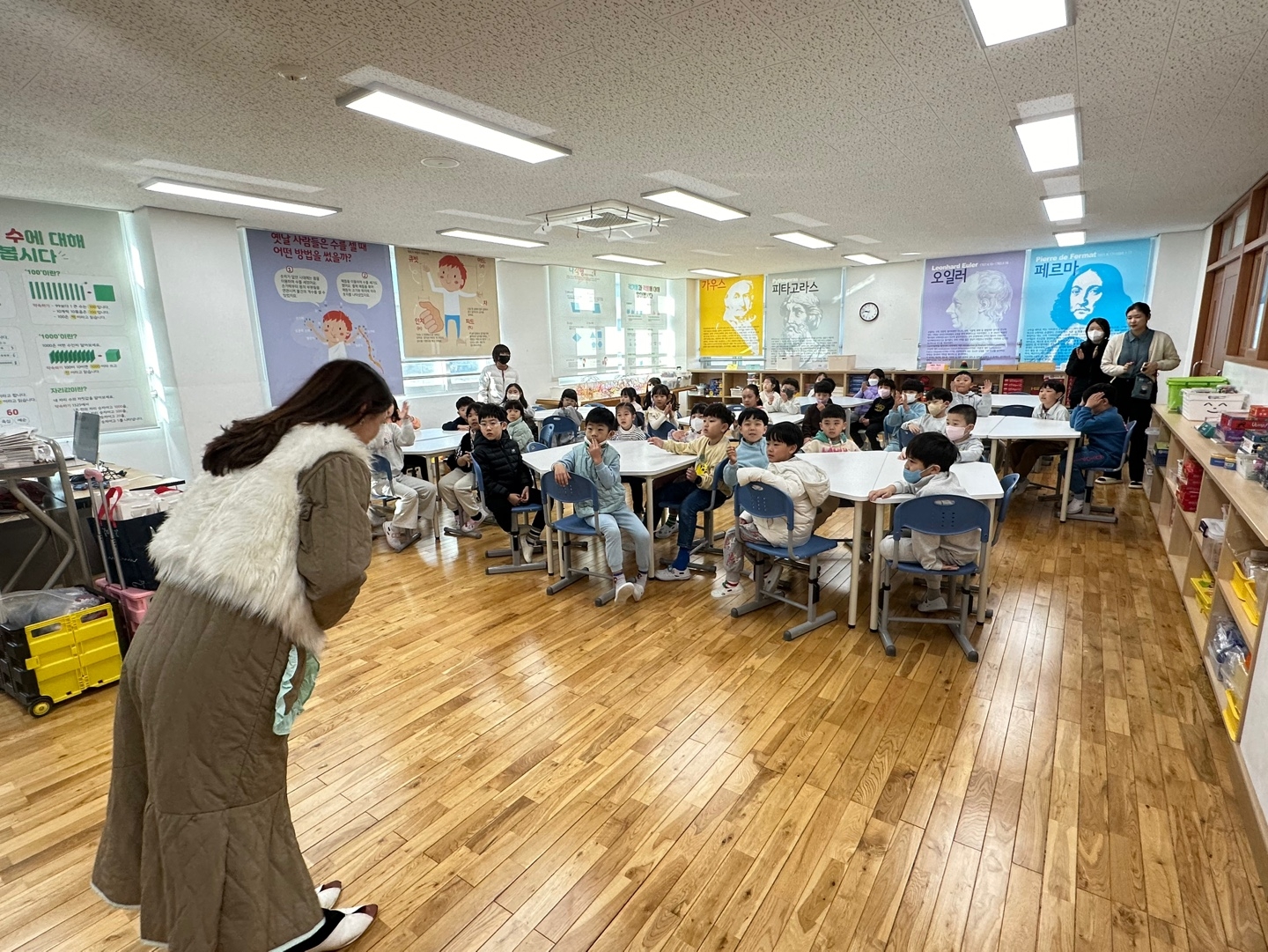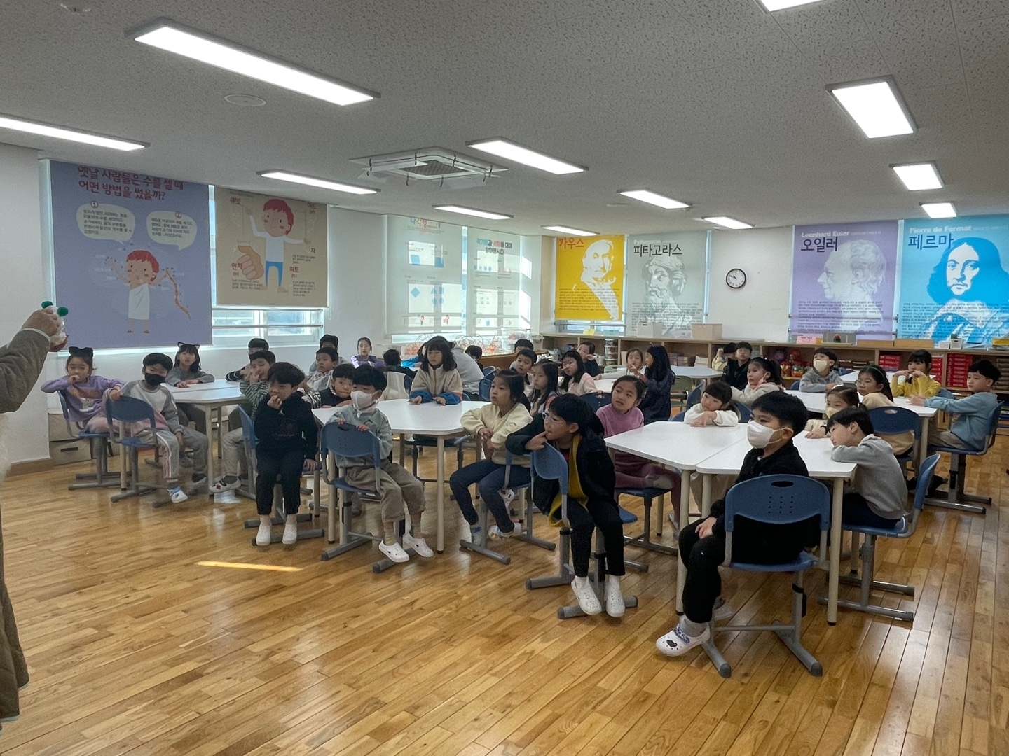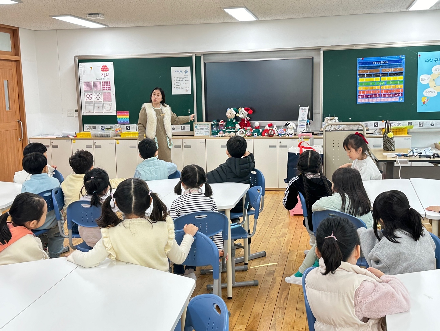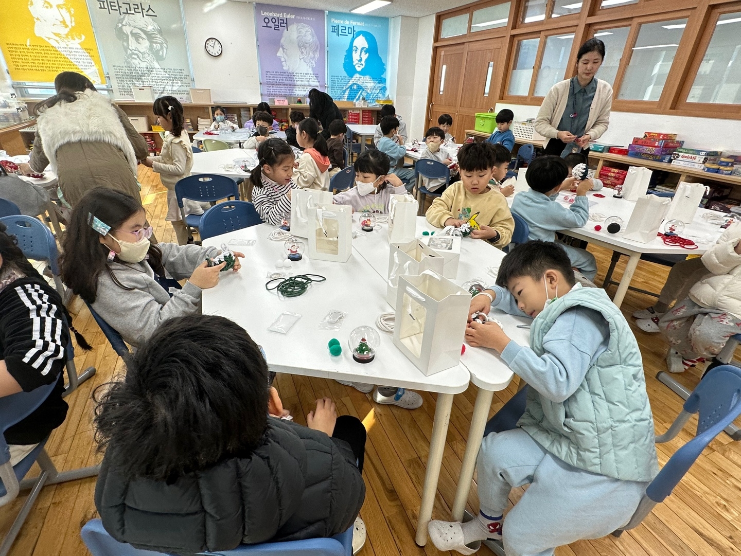 12월 13일 오늘은 1학년과 함께하는 유초이음 어울림DAY! 오늘은 초등학교 수학체험실이라는 특별실에서 1학년 1반, 7반 형님들과 함께 양말목 크리스마스 무드등 만들기 활동을 해보았어요! 미르1반, 2반 친구들이 11월부터 관심을 가지고 놀이하고 있는 ‘양말목’을 형님들에게도 소개해주고 함께 무드등 만들기를 해보았답니다! 양말목은 발등과 발끝을 연결하는 양말의 한 부분으로 양말의 생산과정에서 만들어지는 산업폐기물이에요! 버려지는 자투리들을 모아 새로운 가치를 가진 다양한 공예 작품들을 만들기 시작하며 양말목이 다양하게 활용되기 시작했답니다! 특히 양말목의 가장 큰 매력은 양손만 있다면 다른 재료나 도구 없이도 무궁무진하게 다양한 작품들을 만들 수 있다는 점이에요~!*^^* 같은 모둠이 된 형님들과 자연스럽게 소통하며 서로 도움을 주고 받기도 하고 도란도란 이야기도 나누며 즐거운 시간을 보냈어요! 오늘 아이들이 만들어 간 예쁜 무드등과 함께 미리 크리스마스~!*^^*