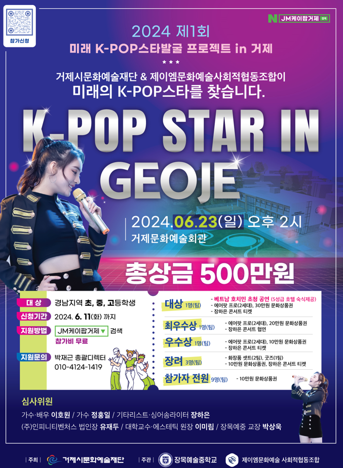 가. 행사명: 2024. 제1회 미래 K-POP 스타 발굴 프로젝트 in 거제 나. 일시: 2024. 6. 23.(일)14:00 다. 장소: 거제문화예술회관 라. 대상: 경상남도 지역 초·중·고등학생 마. 인원: 300명 이상 바. 홍보 동영상 자료 참조 : 장목예술중학교 인스타그램(https://www.instagram.com/jangmokms/)
