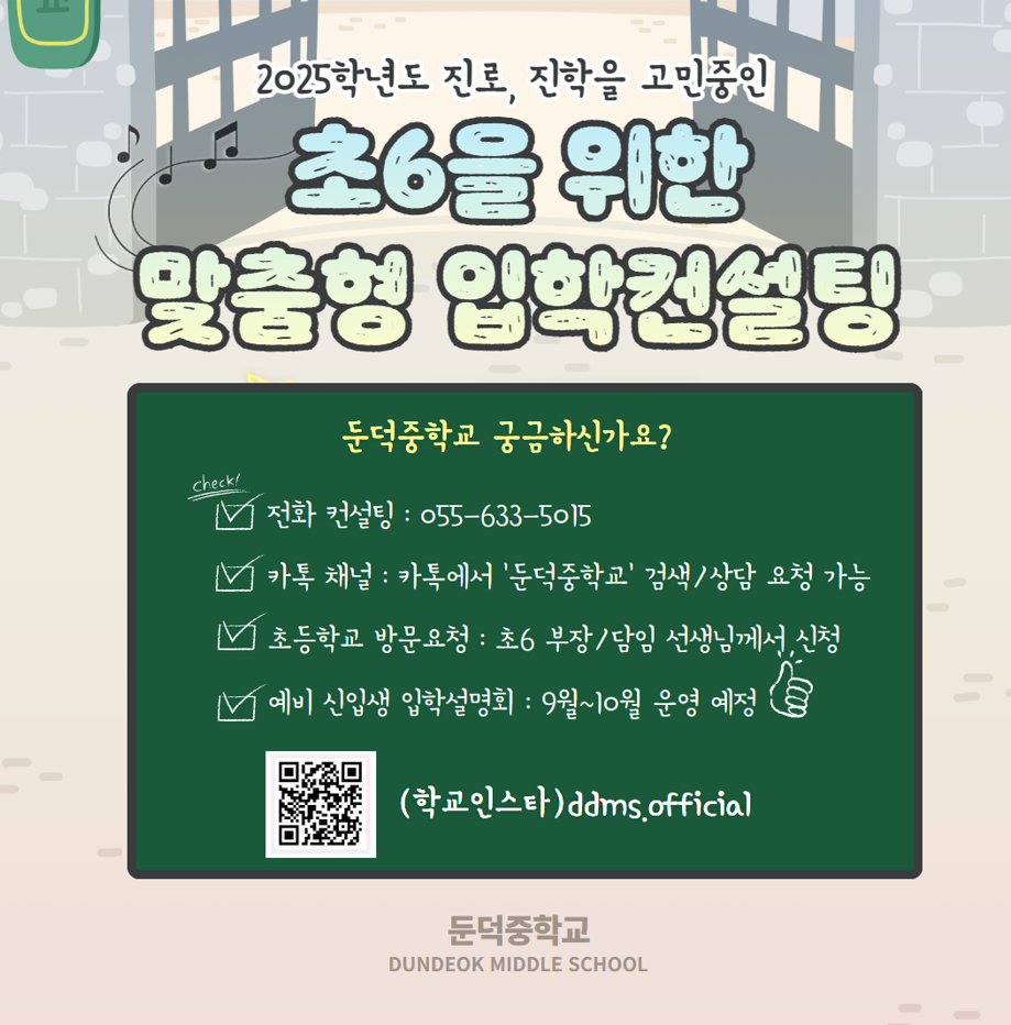 ---------------------------------------------------- 둔덕중학교는 2022학년도부터 시행된 광역학구제로 동 지역 소재 초등학교 졸업생들도 입학이 가능해졌습니다. 이에 중학교 진학을 앞둔 초등학교 6학년들의 진로, 진학 선택에 도움을 주고자 아래와 같이 입학 컨설팅을 운영한다고 합니다. 관심 있는 가정에서는 참고 바랍니다.