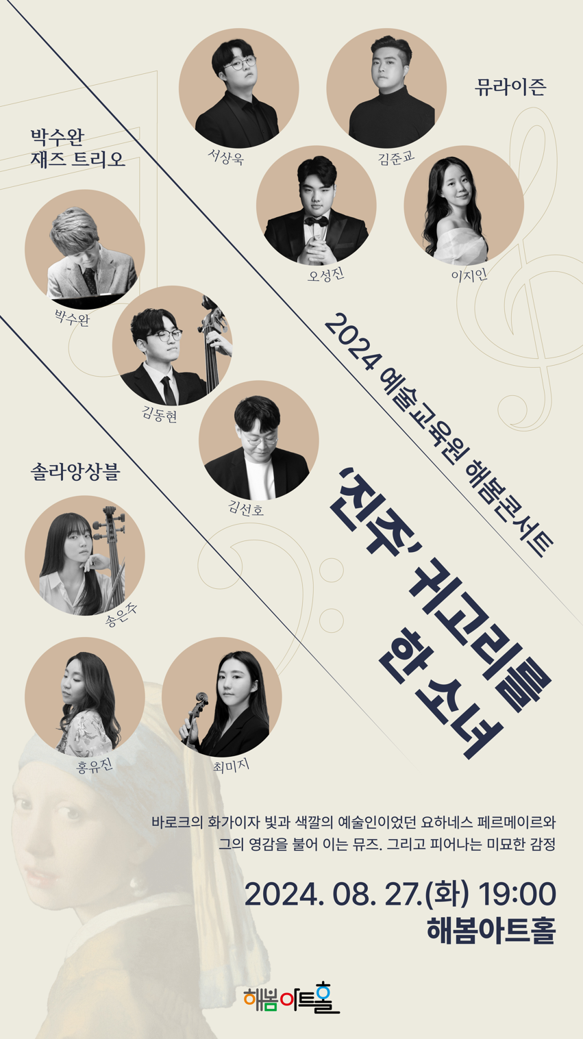 진주귀걸이를 한 소녀 | 박수완 재즈밴드 누벨마리에 콰르텟 혼성중창단 뮤라이즌 | 8.13.(월) 09:00~ | 경남예술교육원 해봄아트홀 (진주 문산) |