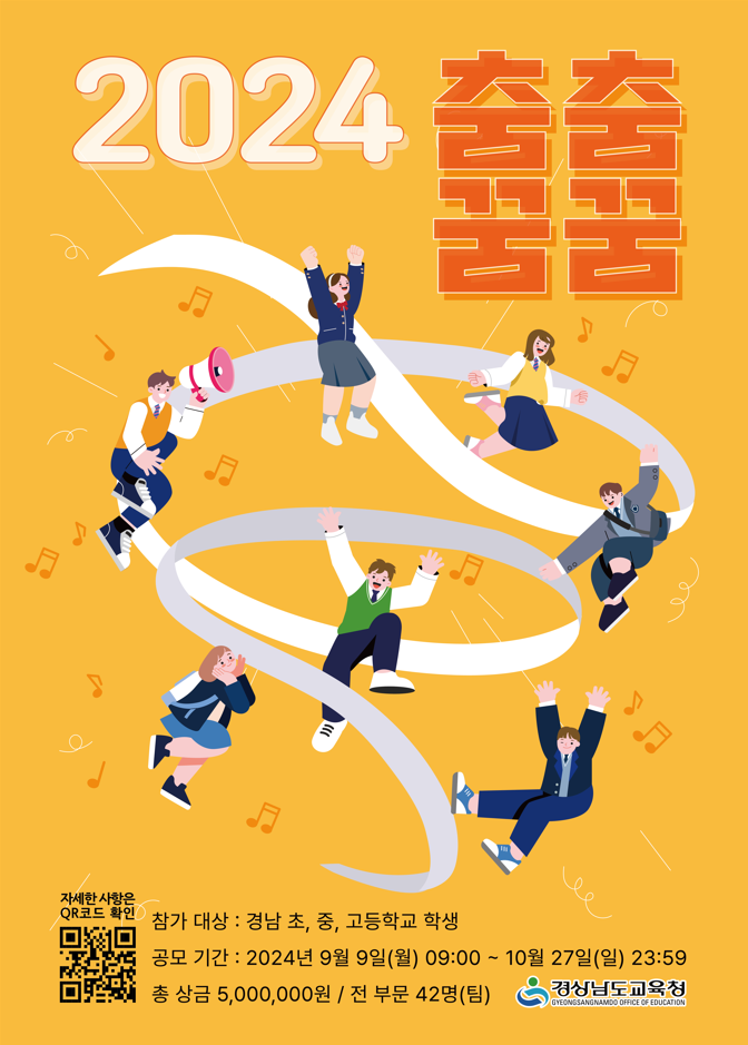 ?『춤춤꿈꿈』이란? 친근한 춤을 통해 경남교육 학생들의 꿈과 끼를 펼칠 수 있는 장 마련으로 문화?예술의 큰 부분을 차지하는 춤을 통해 건강한 청소년 문화 활동을 독려하는 댄스 영상 공모전입니다. ※ 모집대상 : 경상남도 학생(초·중·고) 중 희망자 ※ 신청기간: 2024. 9. 9.(월) 09:00 ~ 10. 27.(일) 23:59 ※ 시상인원: 총 42명(팀) ※ 상금: 1인(팀)당 우수상 200,000원, 기타 시상 100,000원, 총 5,000,000원 ※ 결과발표: 11월 15일(금) 개별 문자 안내 및 SNS 공지 ※ 출품된 영상은 경상남도교육청 SNS 활용을 위하여 복제, 편집, 전송, 배포할 수 있음 ? 어떻게 신청 하나요? ※ 신청방법 - 방법: 1. (붙임) 포스터 내 QR코드 ▷ 신청하기 2. 경상남도교육청 인스타그램 내 카드뉴스 또는 상단 링크 ▷ 신청하기 3. http://www.gne-dance.kr/ ▷ 신청하기 (★ 신청기간 내 형식에 맞춰 신청하기 바랍니다.) ※ 문의 : 경상남도교육청 홍보담당관 055-278-1788