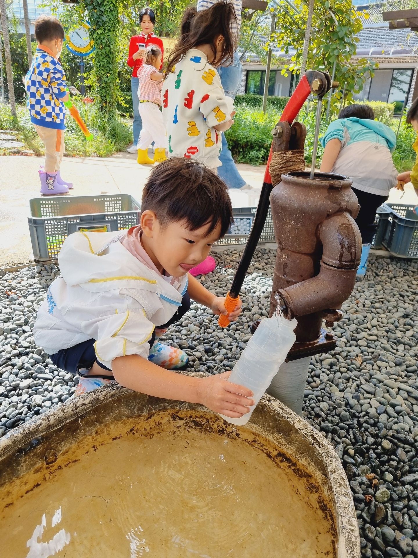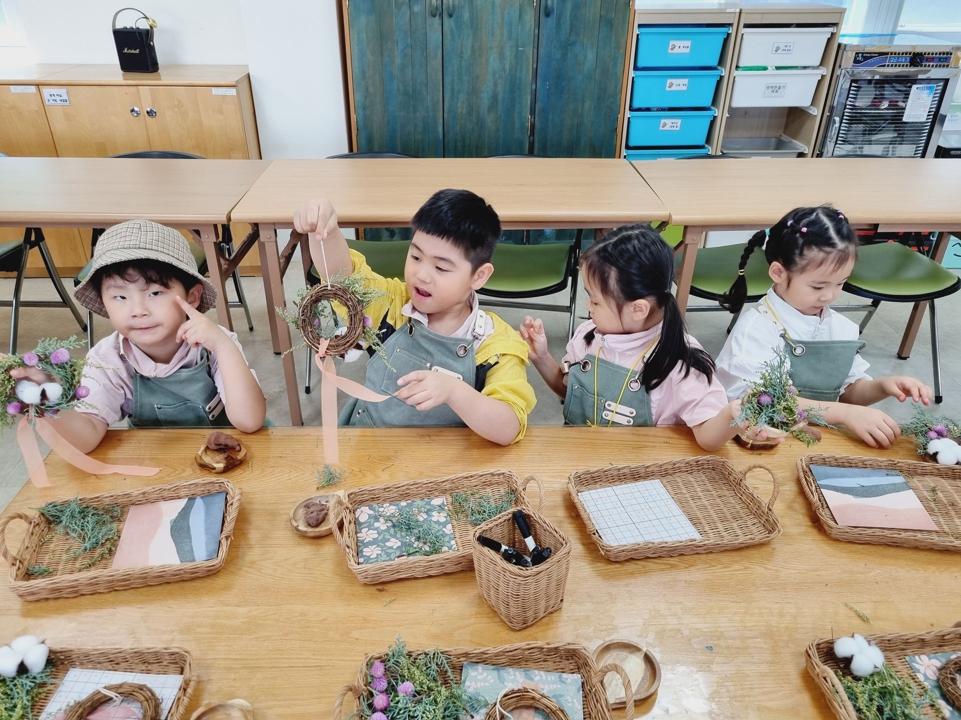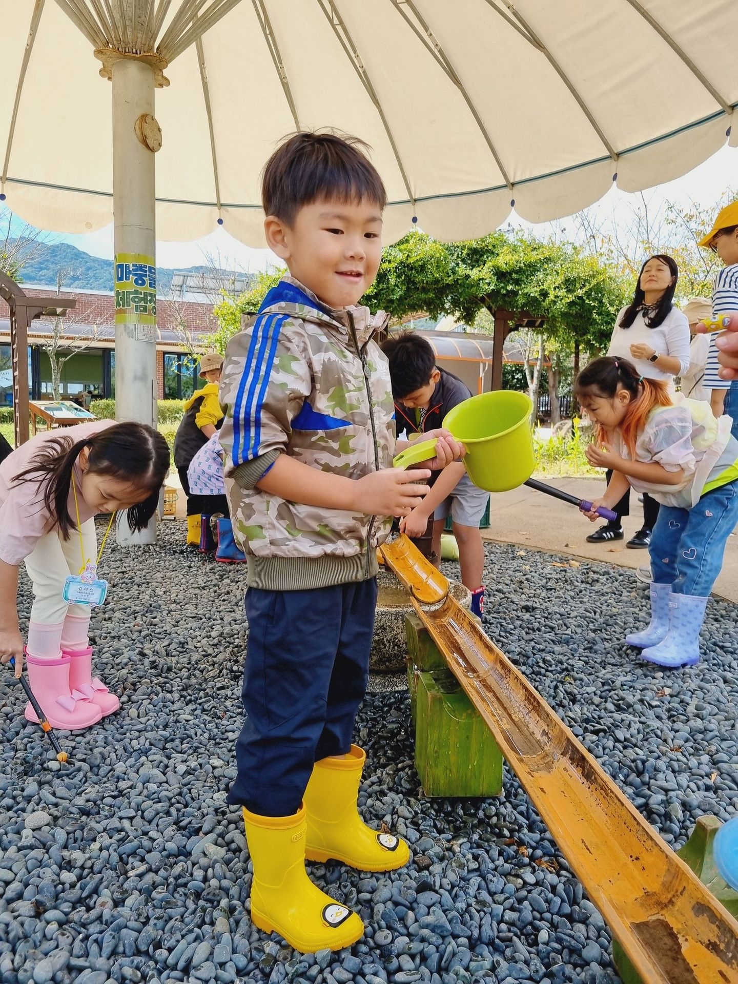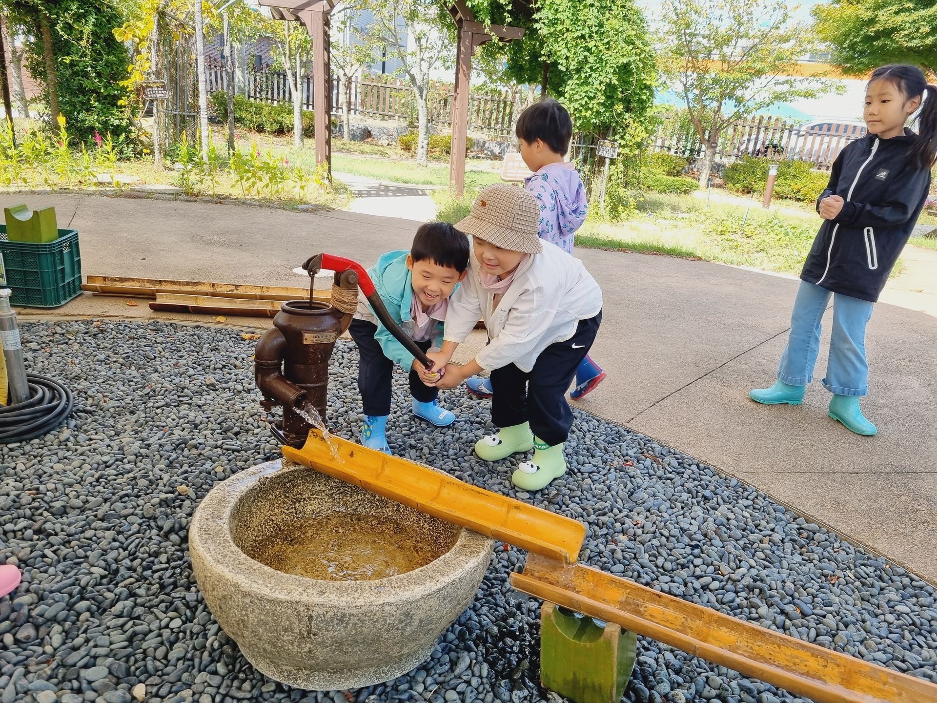 유아교육원 김해체험분원으로 현장학습을 다녀왔어요. 실내체험교실에는 공룡, 전통, 땅속, 물속, 초록 마을이 있어 친숙하면서 흥미롭고 다양한 놀이를 하였답니다. 실외에서는 흙산놀이로 비료포대 썰매를 타기도 하고, 자연물을 이용한 식물리스도 만들어 보구요 펌프질 하기 전 물을 끌어올리기 위해 붓는 마중물을 넣어서 펌프질 하여 물길도 만들고 물총놀이도 했어요. 해 본 놀이고, 할 수 있는 놀이는 우리 아이들이 시간 가는 줄 모르게 집중하고, 자기주도와 자존감을 퐁퐁 샘솟게 하겠지요^^