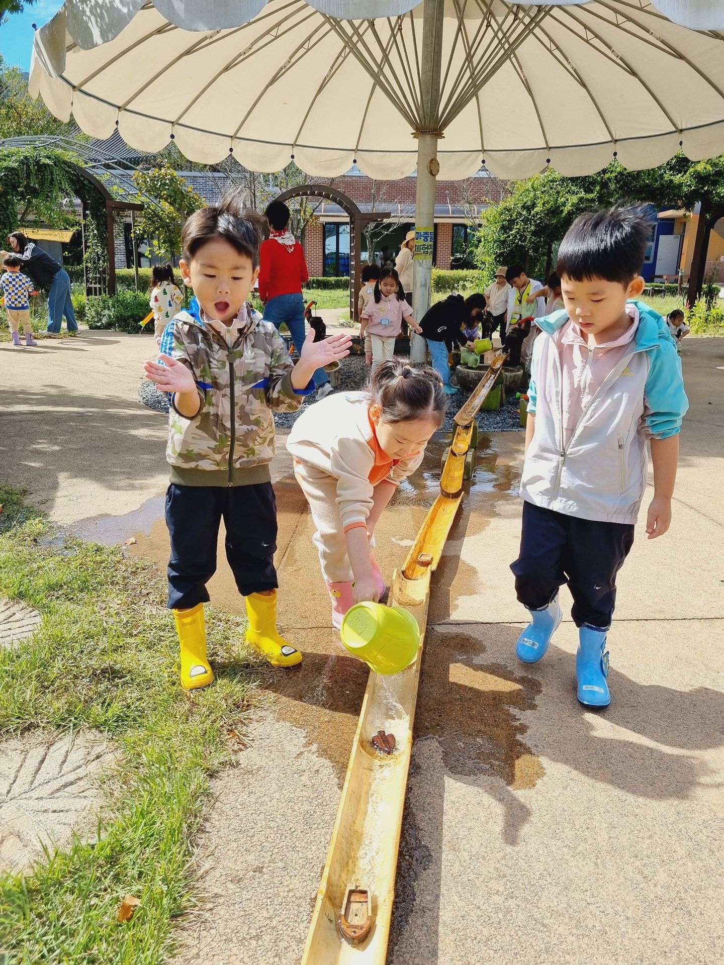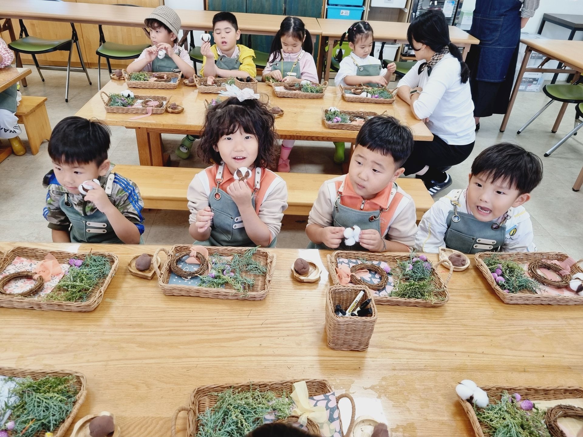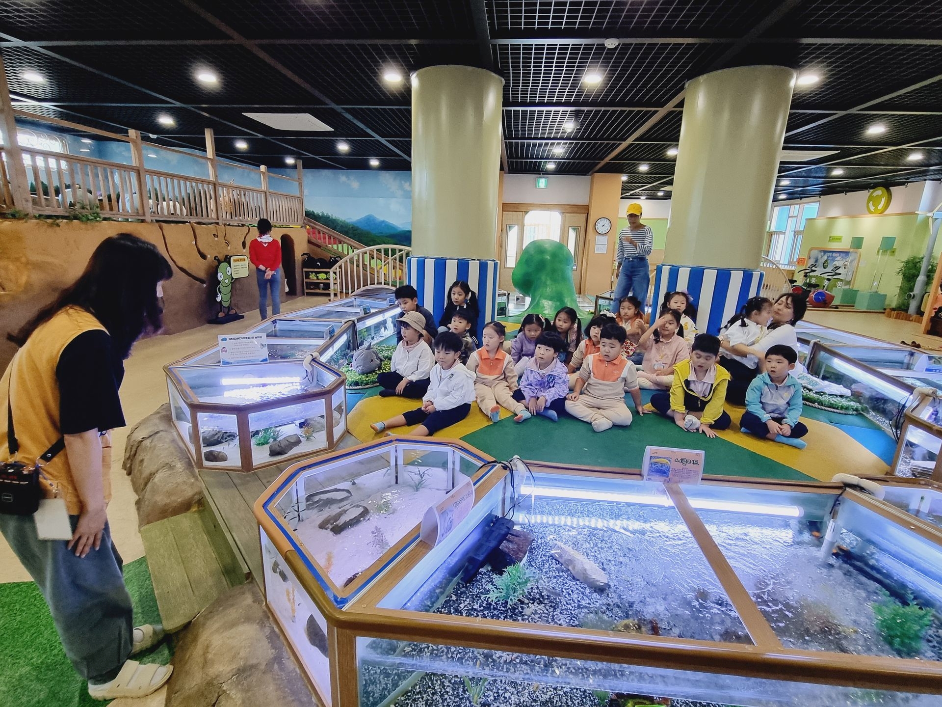 유아교육원 김해체험분원으로 현장학습을 다녀왔어요. 실내체험교실에는 공룡, 전통, 땅속, 물속, 초록 마을이 있어 친숙하면서 흥미롭고 다양한 놀이를 하였답니다. 실외에서는 흙산놀이로 비료포대 썰매를 타기도 하고, 자연물을 이용한 식물리스도 만들어 보구요 펌프질 하기 전 물을 끌어올리기 위해 붓는 마중물을 넣어서 펌프질 하여 물길도 만들고 물총놀이도 했어요. 해 본 놀이고, 할 수 있는 놀이는 우리 아이들이 시간 가는 줄 모르게 집중하고, 자기주도와 자존감을 퐁퐁 샘솟게 하겠지요^^