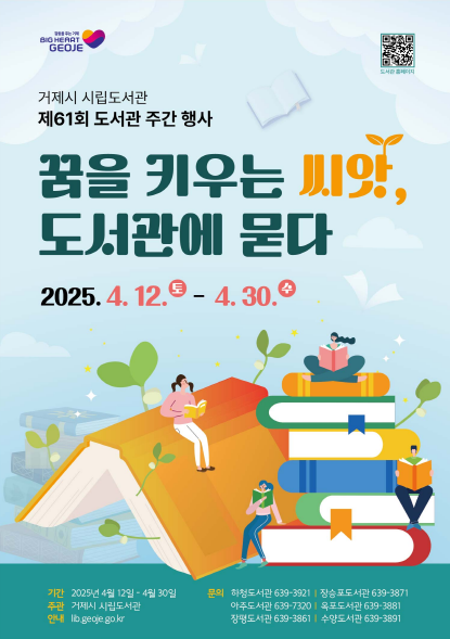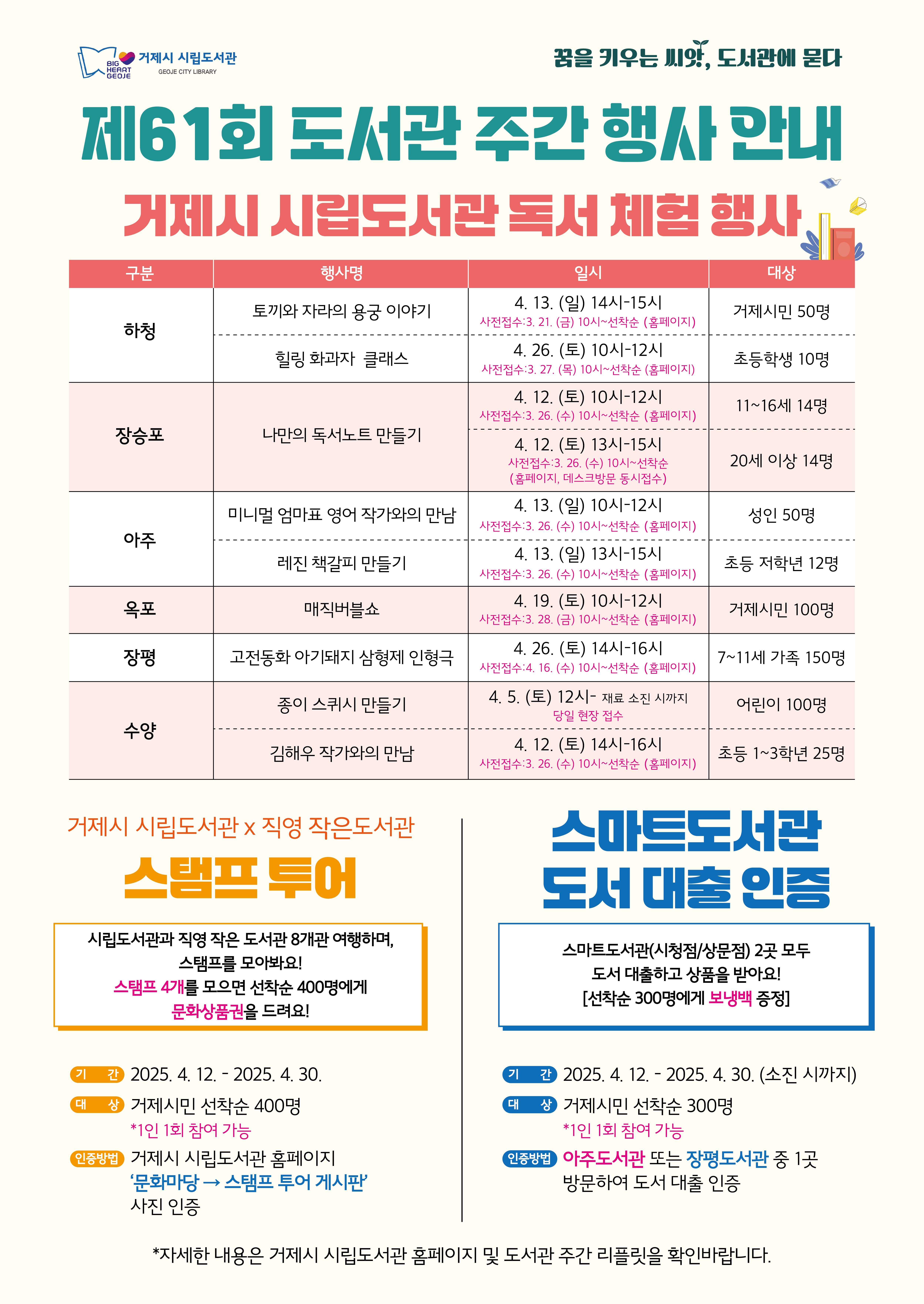 거제시 시립도서관에서 제61회 도서관 주간을 맞이하여 다양한 행사를 개최합니다. 많은 관심과 참여 바랍니다.