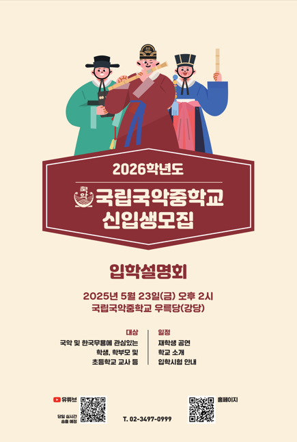 국악 및 한국무용 진로에 관심있는 초등학생, 학부모 및 초등학교 선생님들을 대상으로 입학설명회를 진행하오니 많은 참여 부탁드립니다. 가. 일시 : 2025. 5. 23.(금) 14:00 나. 장소 : 국립국악중학교 우륵당(강당) 다. 대상 : 우리학교 입학에 관심 있는 학생, 학부모 및 초등학교 교사 라. 내용 : 재학생 공연, 학교소개, 입학시험 설명 마. 세부사항 1) 국립국악중학교 유튜브 채널에서 입학설명회 실시간 송출 예정 2) 입학설명회 이후 우리학교 홈페이지에 입시요강 공고 3) 문의 : 02-3497-0999