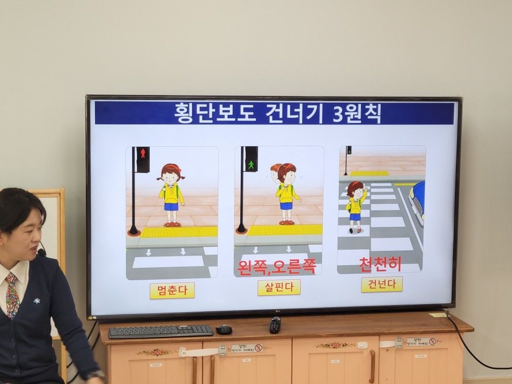 안전한 통학버스 이용법, 어른과 손잡고 걷기에 대해 알아보았어요.