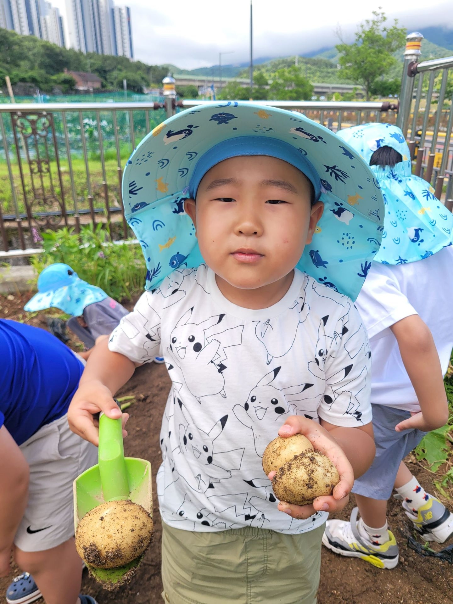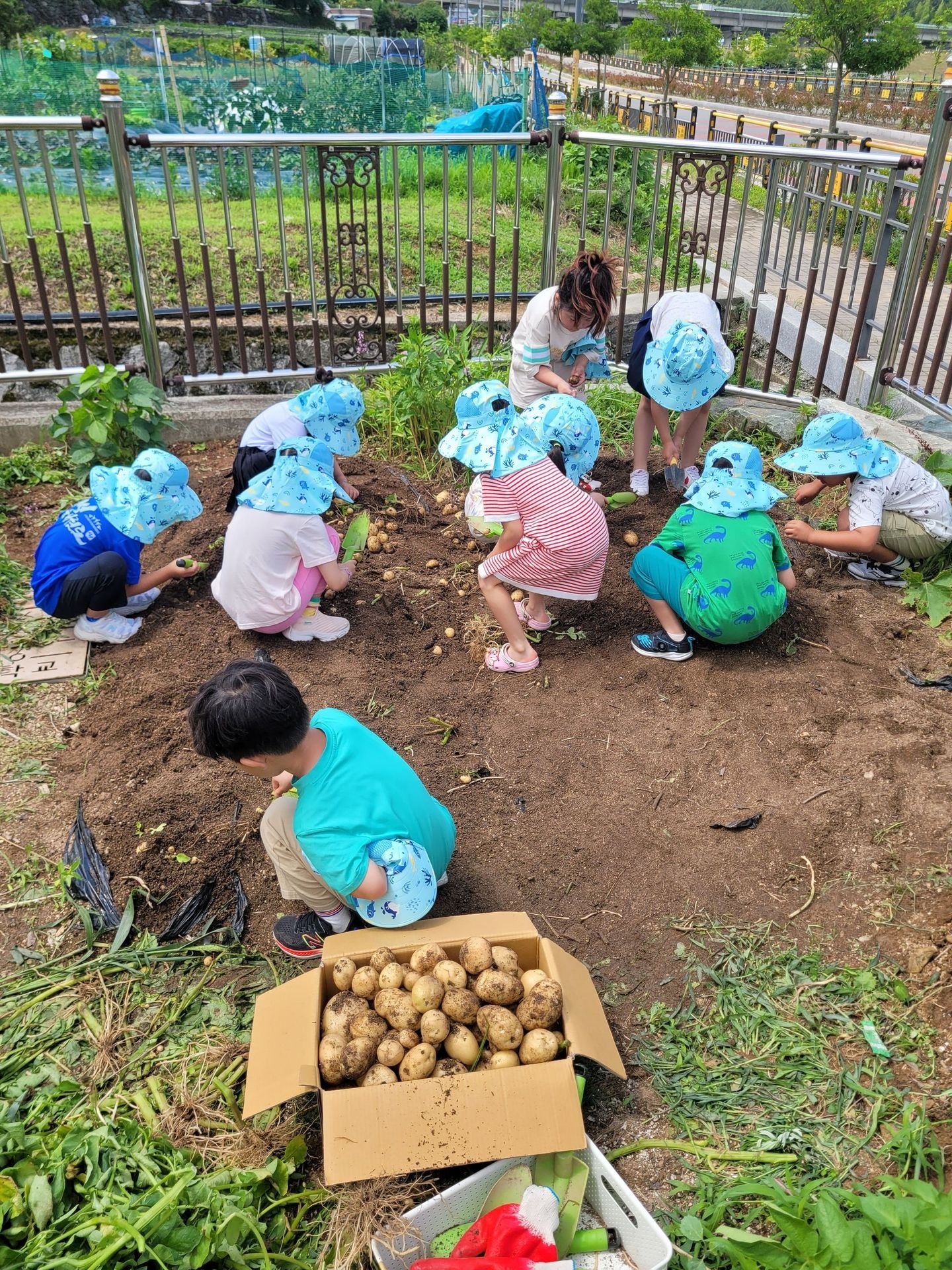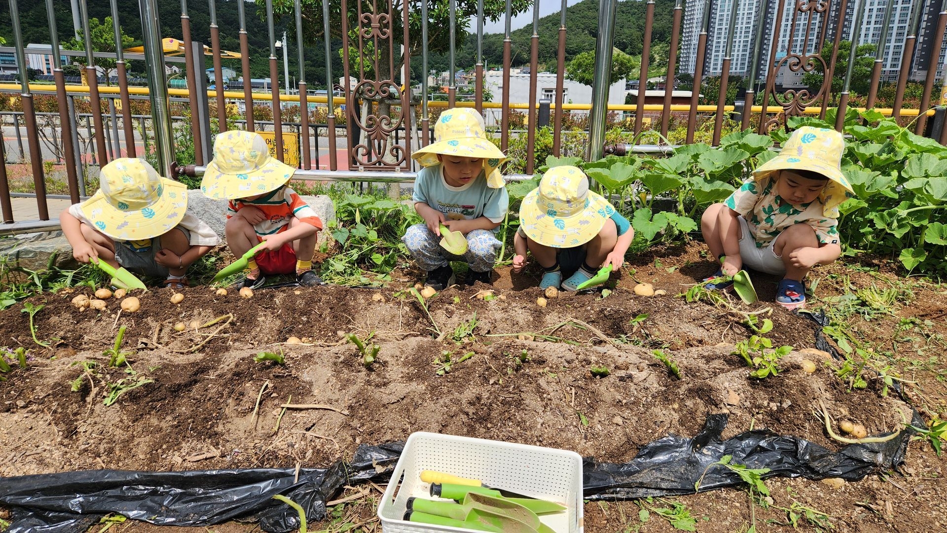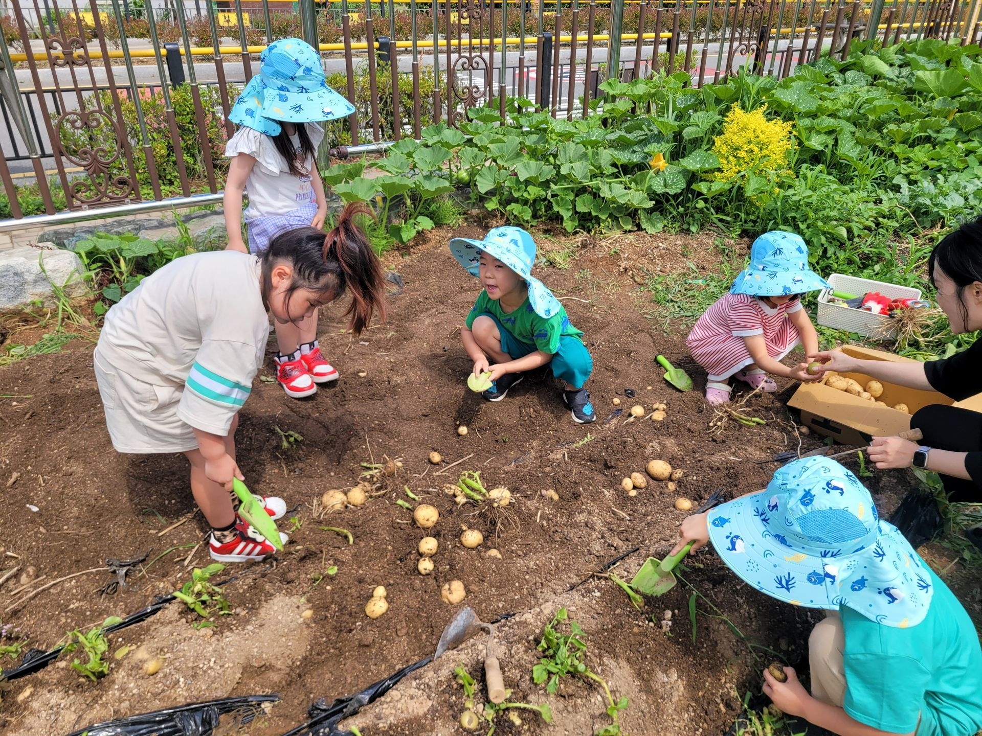 아이들 저마다 구슬땀을 흘리며 감자를 파고 줍고 담기를 반복하며