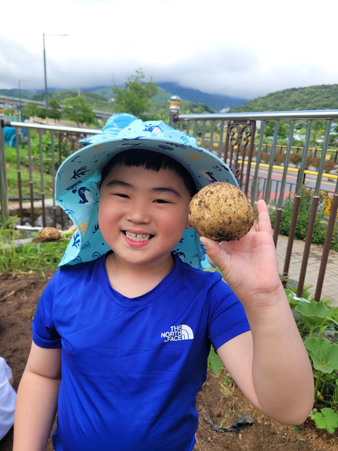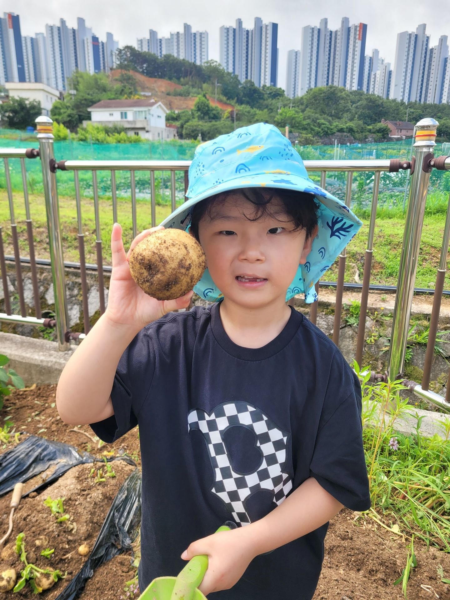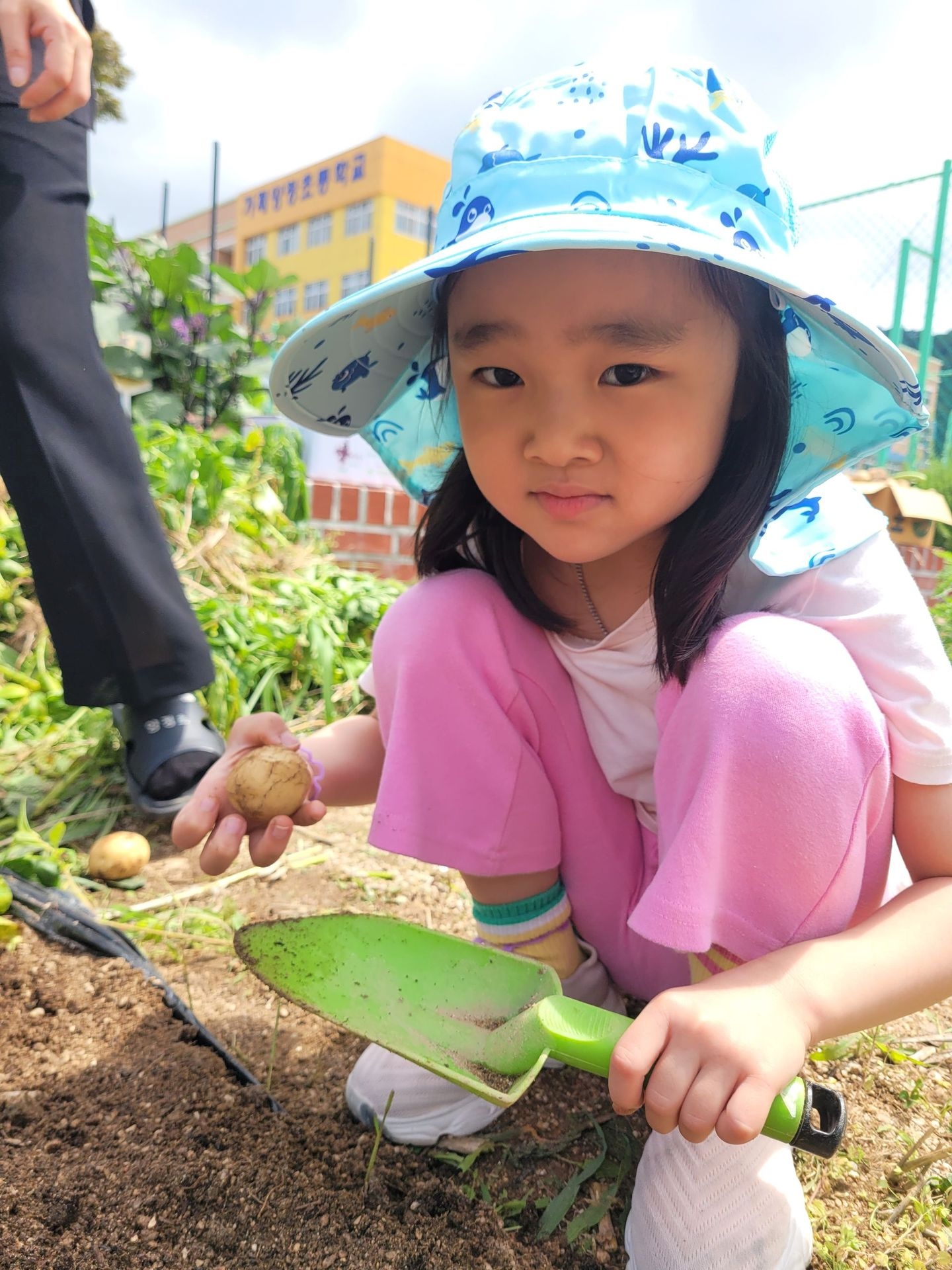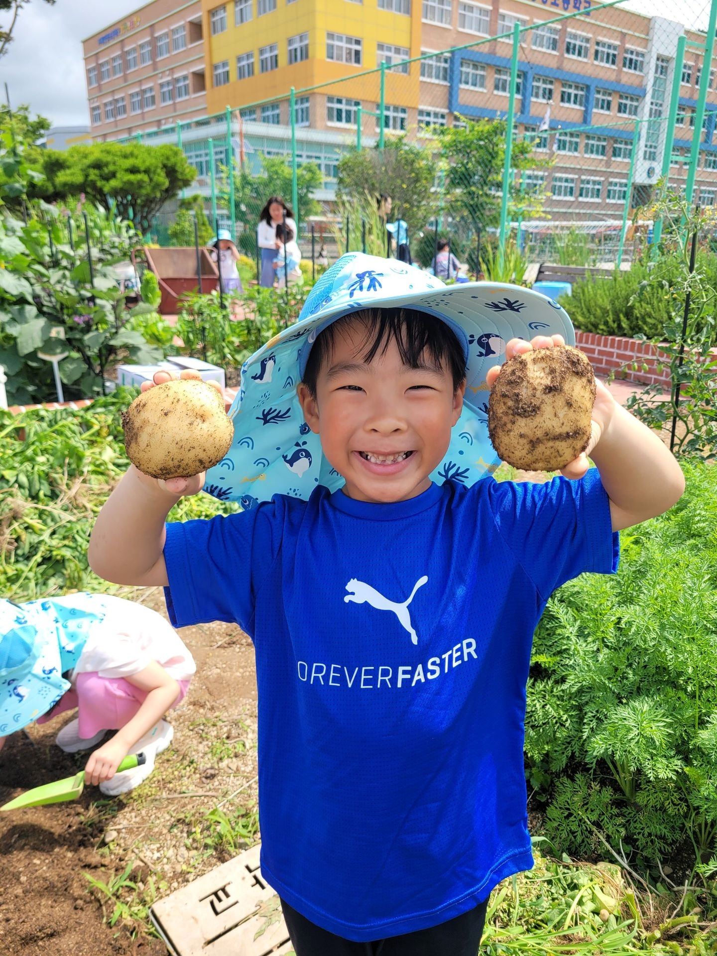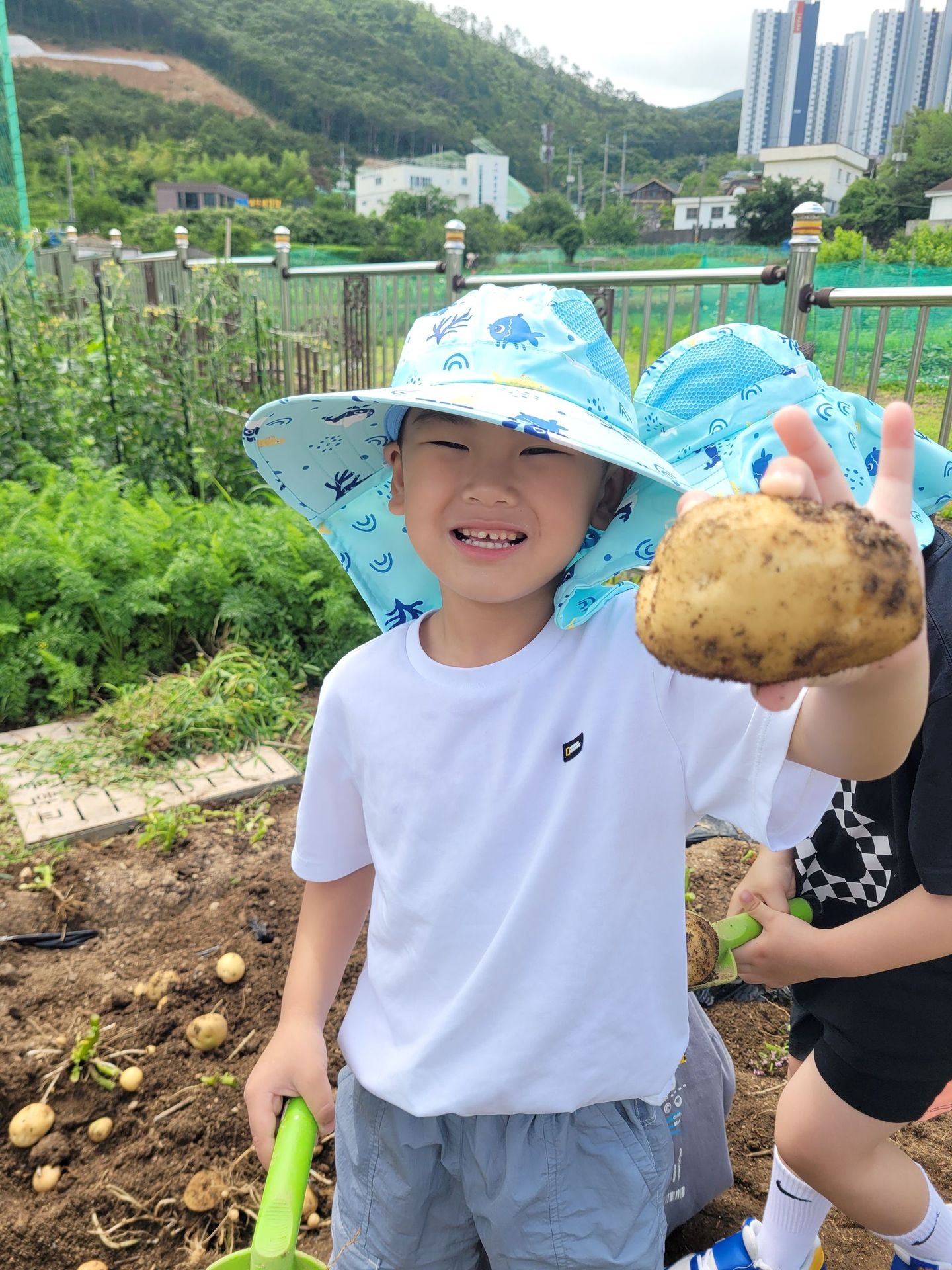 아이들 저마다 구슬땀을 흘리며 감자를 파고 줍고 담기를 반복하며