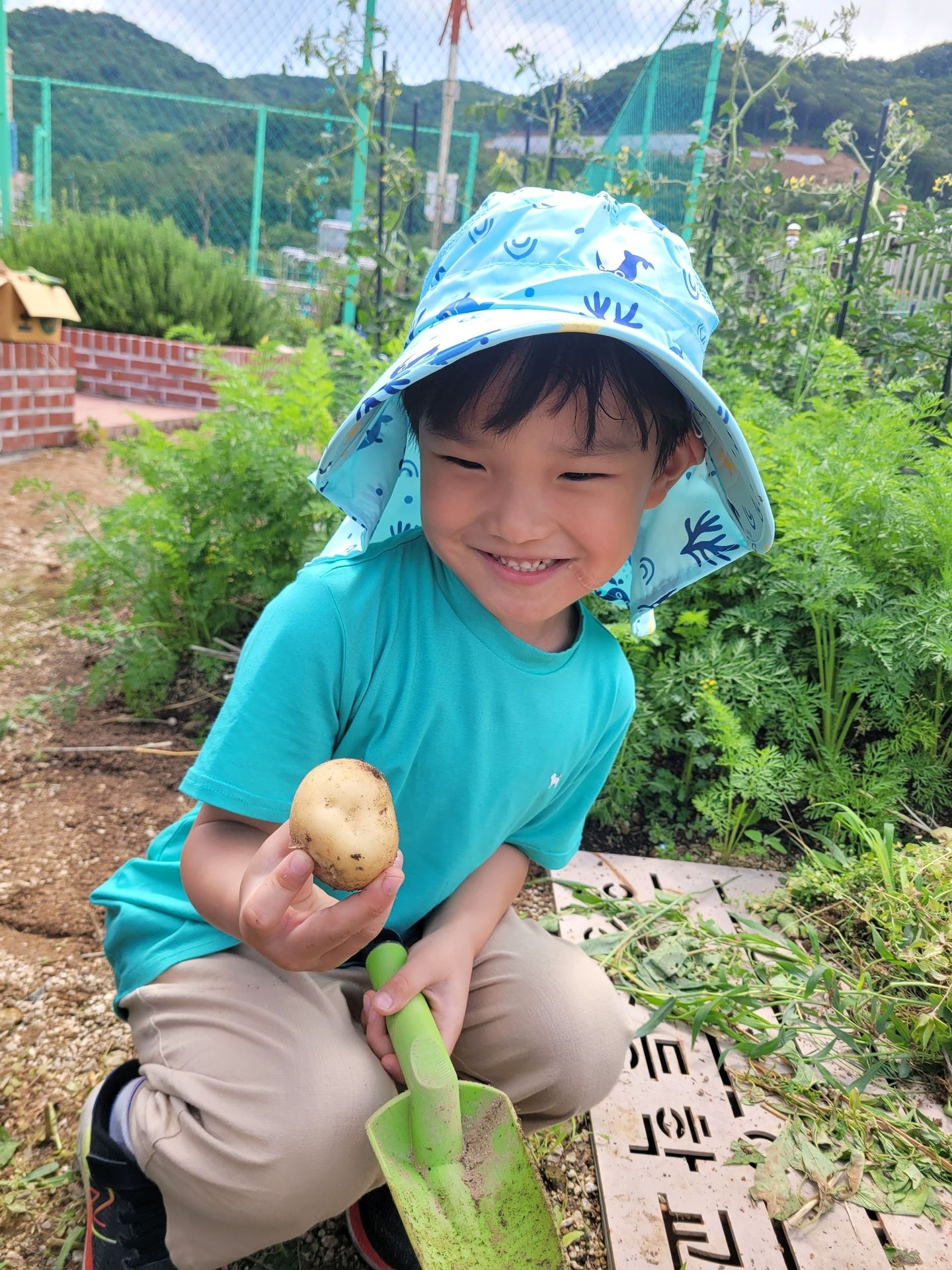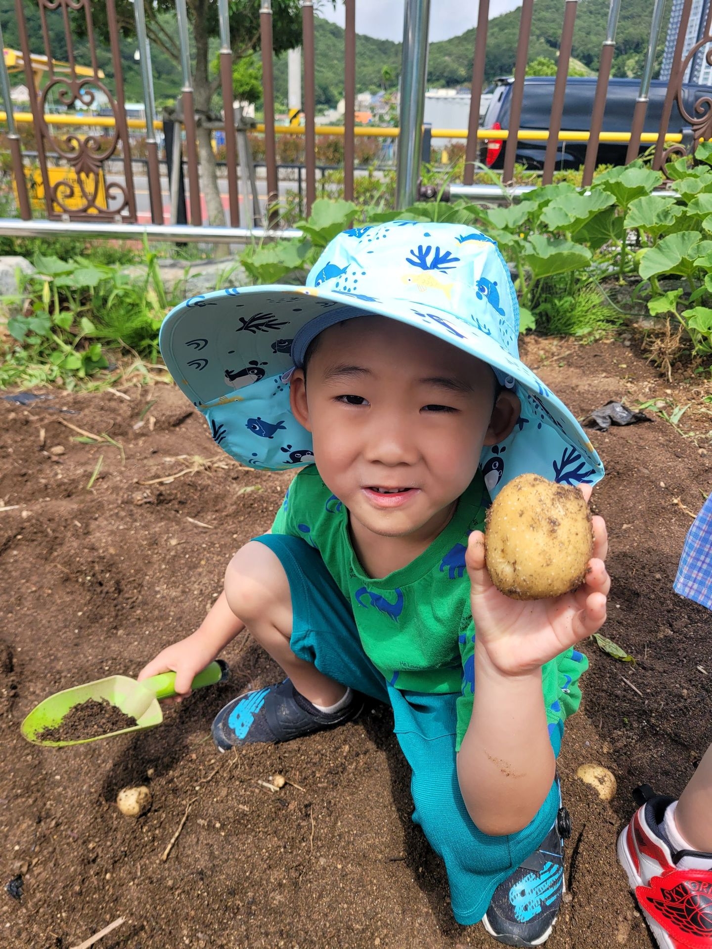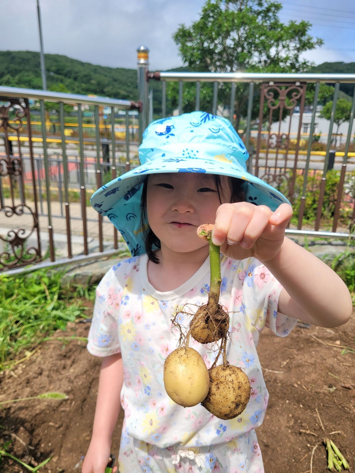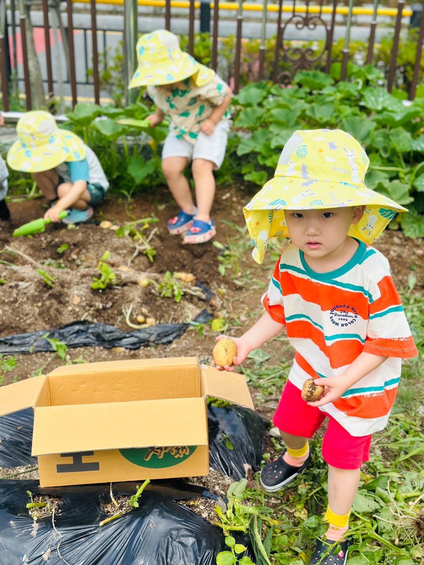 이번 유치원 텃밭에서는 오이따기에 이어 감자캐기를 했어요.
