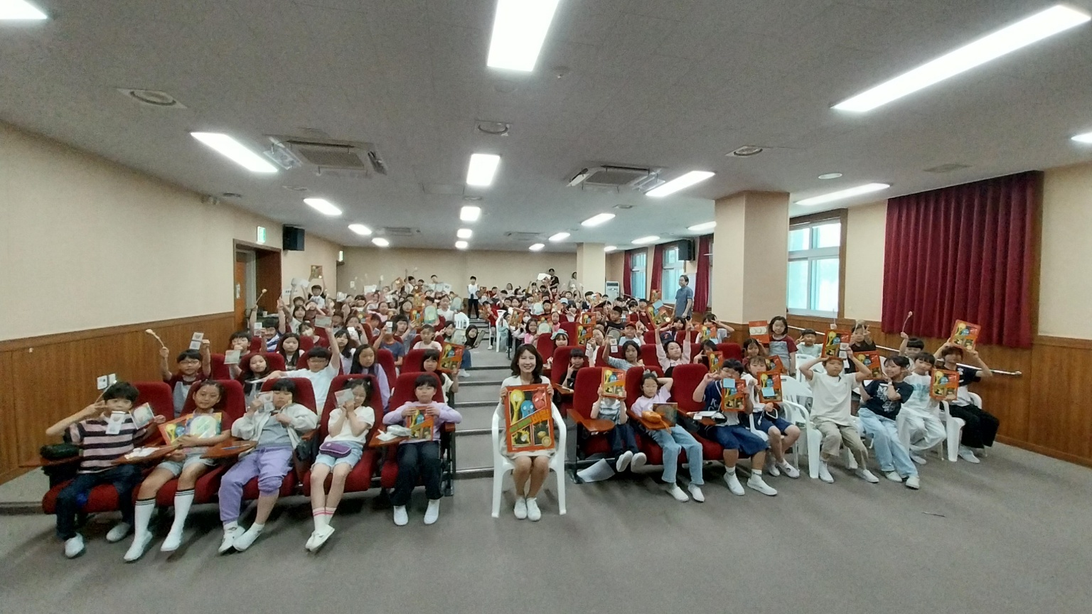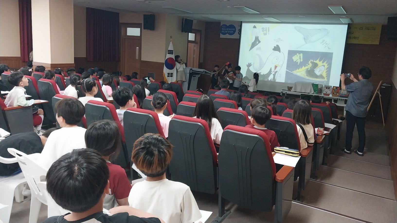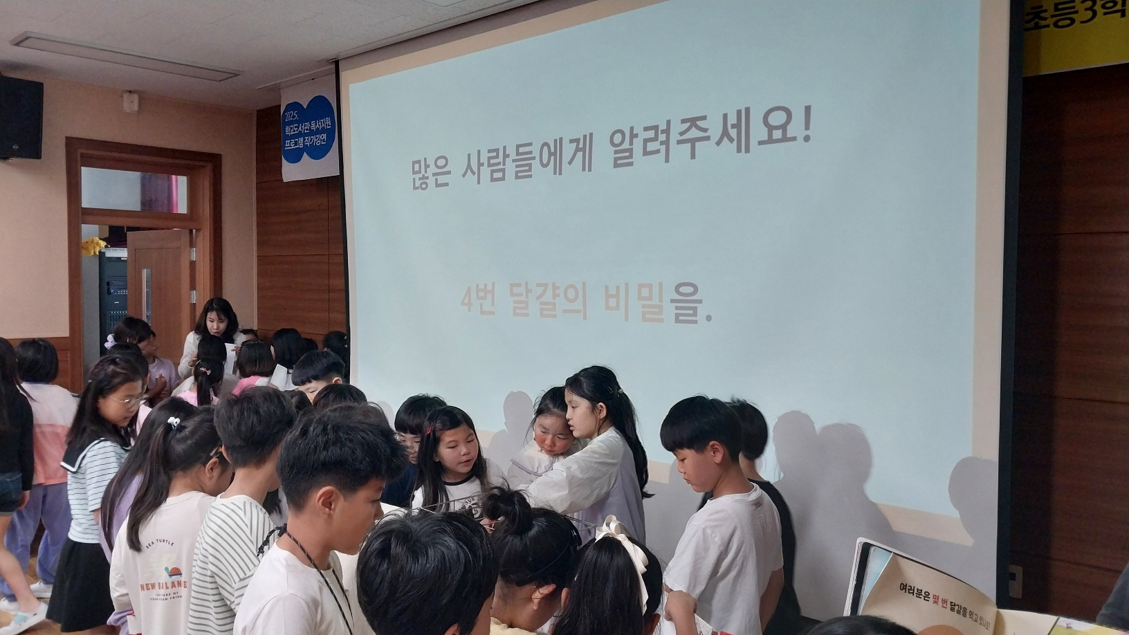 거제도서관의 "학교와 함께하는 책파랑길 같이 걷자!" 프로그램의 일환으로 그림책 『야광 시계의 비밀』, 『4번 달걀의 비밀』, 『쿠키 크림의 비밀』의 저자 하이진 작가와의 만남을 진행했습니다. [하이진 작가의 만남- 불편한 진실로 세상을 바꾸는 그림책] 1. 일시: 2025.5.30.(금) 9시 50분~11시 30분 2. 장소: 시청각실 3. 대상: 본교 3학년 학생 4. 내용: 『4번 달걀의 비밀』 강연, 작가님에게 궁금한 점 질문하기, 퀴즈, 단체사진 촬영, 작가님에게 사인 받기