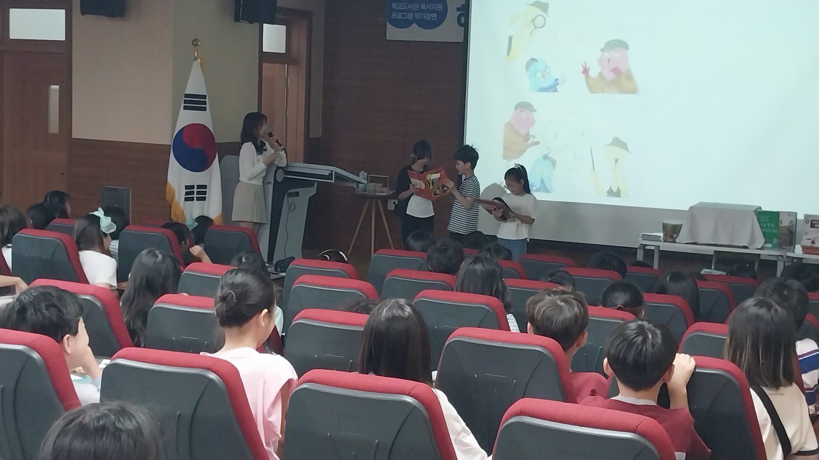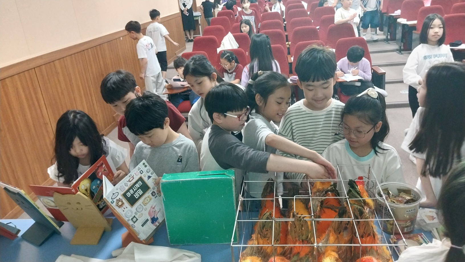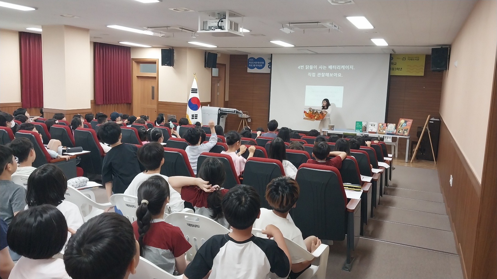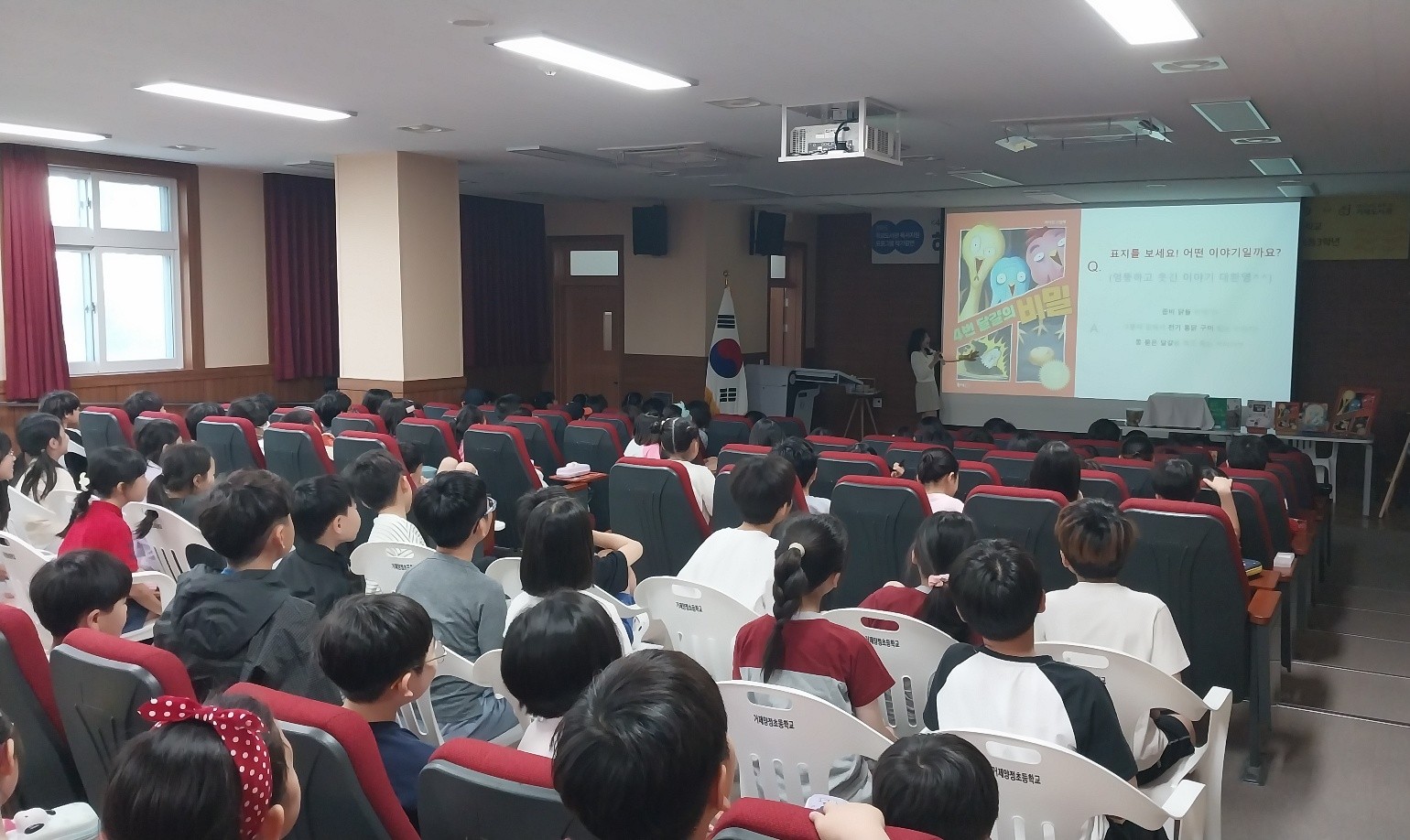 거제도서관의 "학교와 함께하는 책파랑길 같이 걷자!" 프로그램의 일환으로 그림책 『야광 시계의 비밀』, 『4번 달걀의 비밀』, 『쿠키 크림의 비밀』의 저자 하이진 작가와의 만남을 진행했습니다. [하이진 작가의 만남- 불편한 진실로 세상을 바꾸는 그림책] 1. 일시: 2025.5.30.(금) 9시 50분~11시 30분 2. 장소: 시청각실 3. 대상: 본교 3학년 학생 4. 내용: 『4번 달걀의 비밀』 강연, 작가님에게 궁금한 점 질문하기, 퀴즈, 단체사진 촬영, 작가님에게 사인 받기