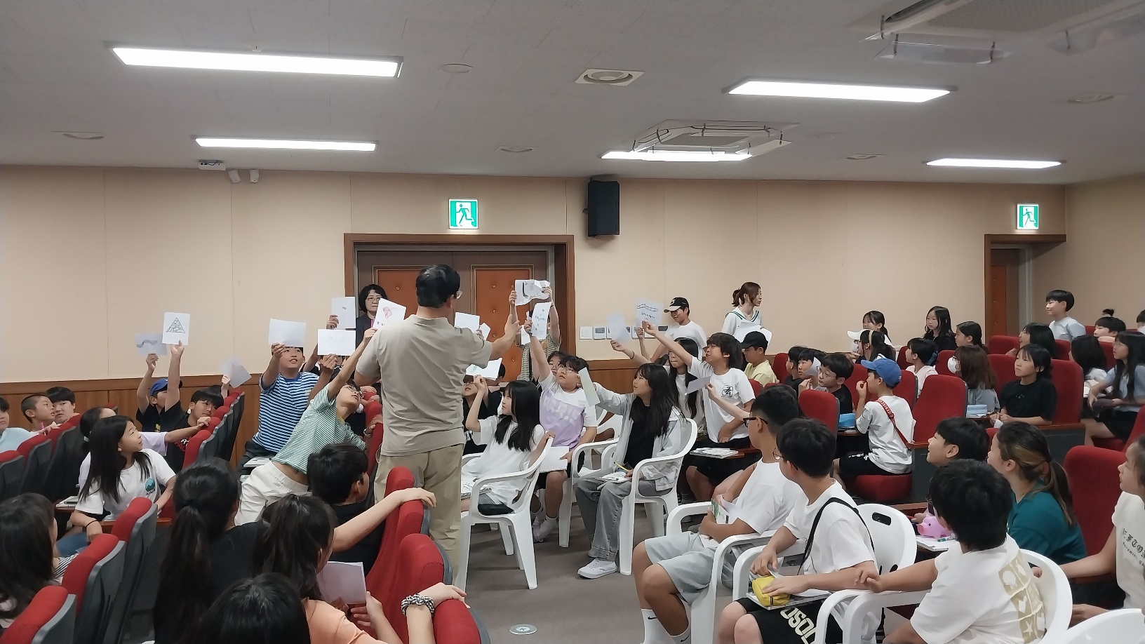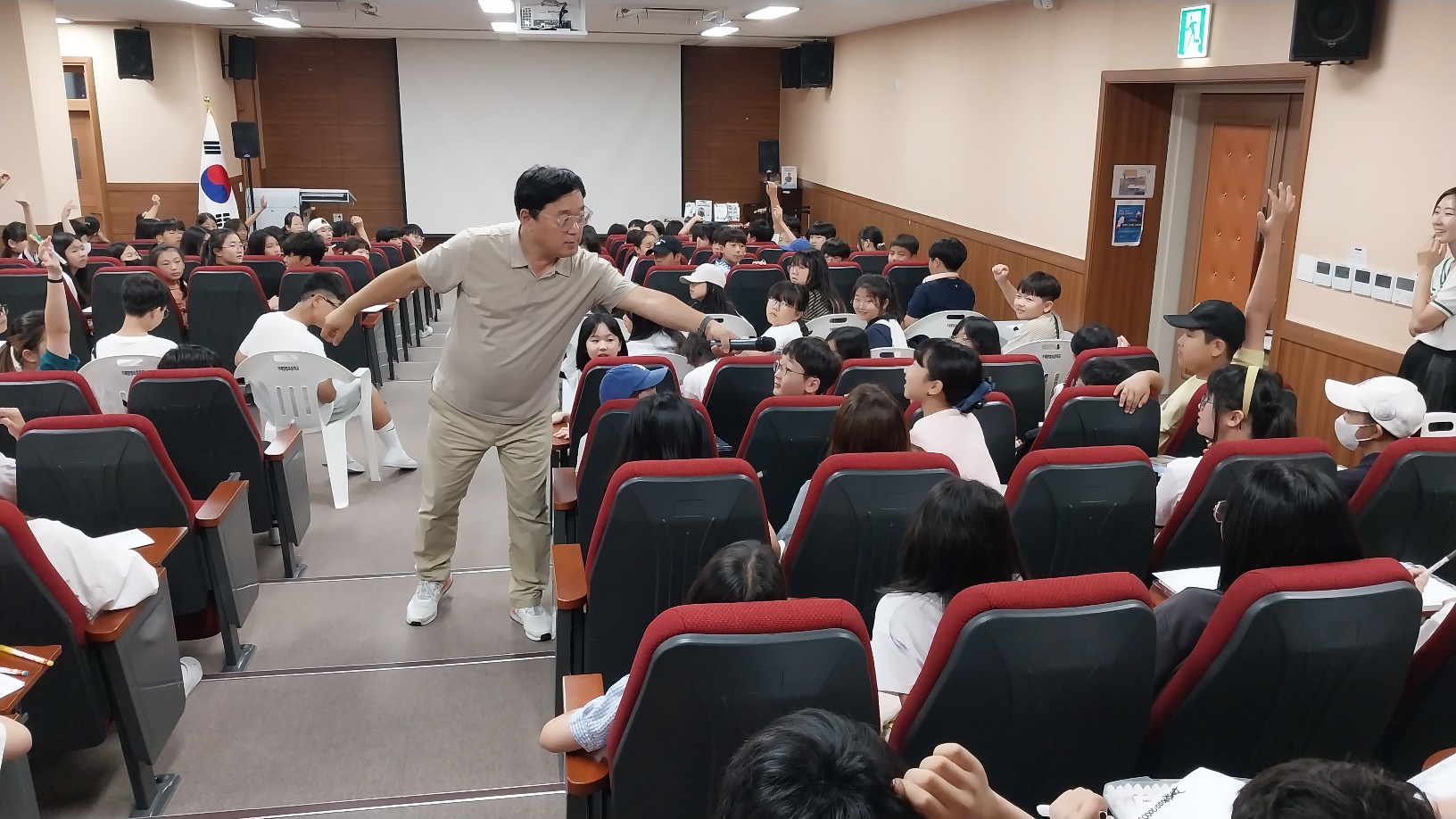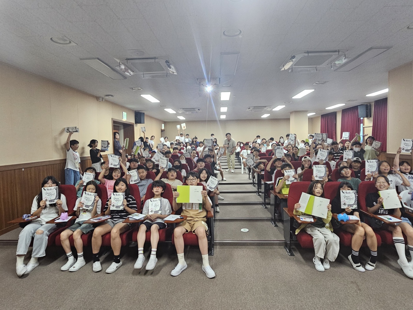 5학년 한 학기 한 권 읽기 활동과 연계하여 『날아라, 삑삑아!』의 저자 권오준 작가와의 만남을 진행하였습니다. 권오준 작가님은 직접 자연에서 보고 듣고 겪은 생태 이야기를 생생하게 들려주며, 책의 내용을 바탕으로 퀴즈와 미션, 질문 활동 등을 통해 학생들과 적극적으로 소통해 주셨습니다. 강연 내내 에너지 넘치고 흥미로운 분위기 속에서 학생들은 생명과 자연의 소중함을 다시 한번 느끼는 뜻깊은 시간을 보냈습니다.
