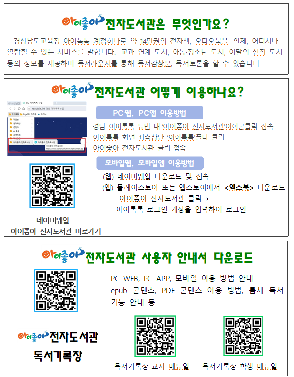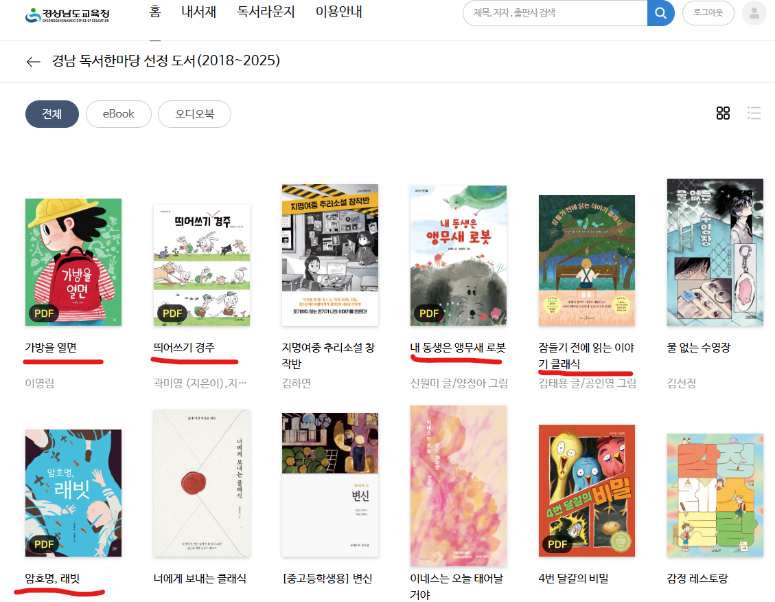 또한 아이좋아 전자도서관에서도 경남독서한마당 선정도서 중 일부를 전자책으로 볼 수 있습니다. 2025년 7월 10일(목) 현재 아이좋아 전자도서관에서 볼 수 있는 경남독서한마당 선정도서(초등)는 아래와 같습니다. 1. 가방을 열면 2. 띄어쓰기 경주 3. 내 동생은 앵무새 로봇 4. 암호명 래빗 5. 잠들기 전에 읽는 이야기 클래식