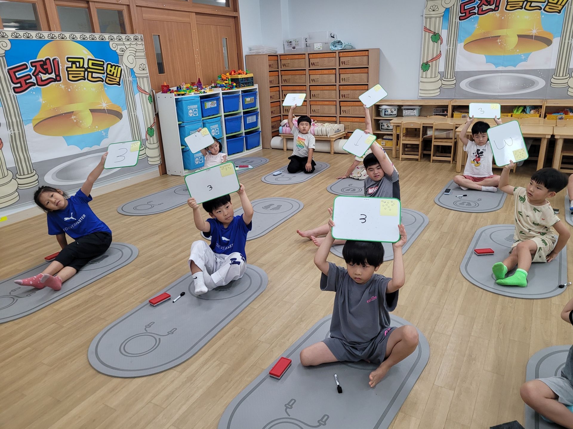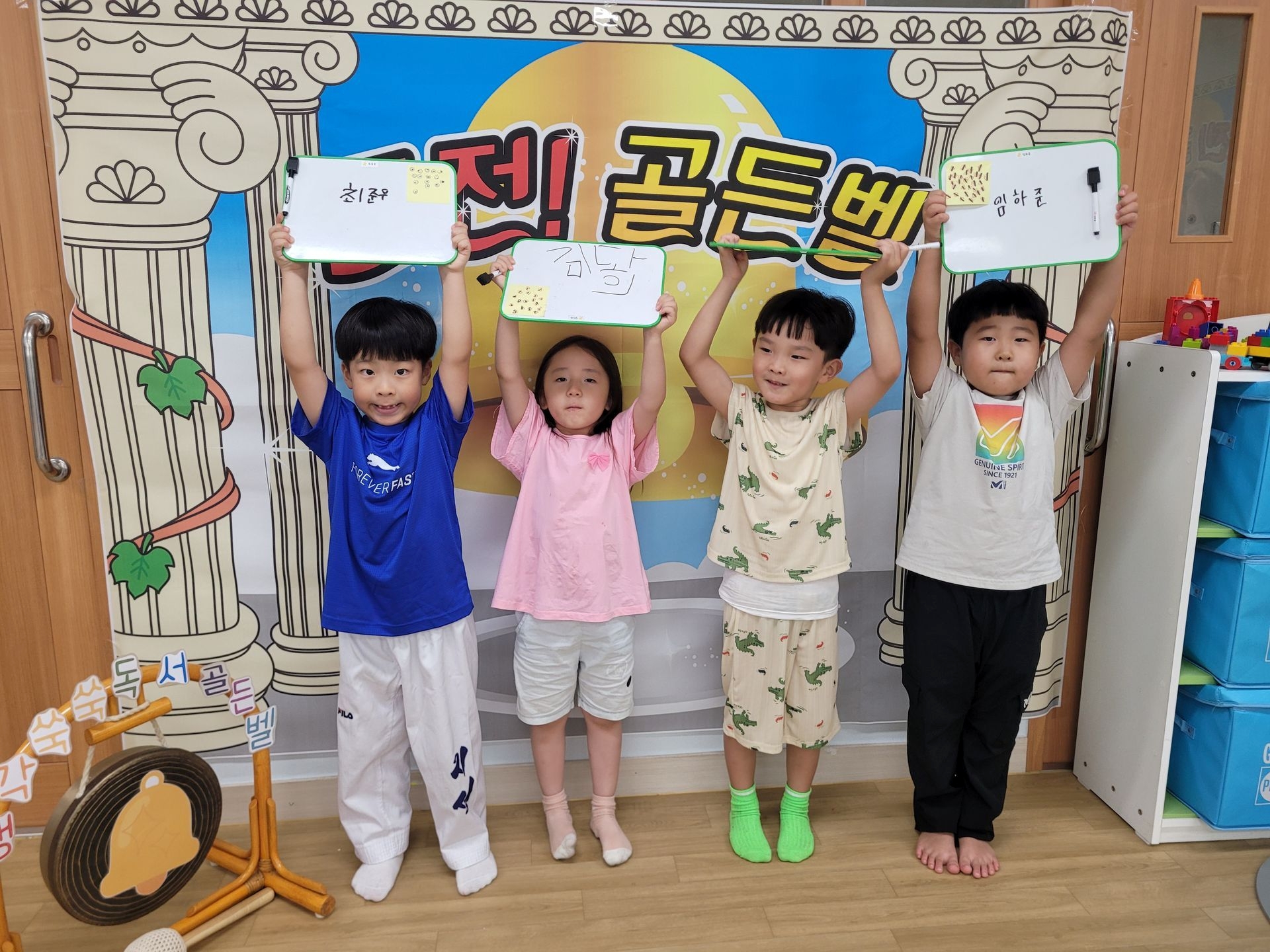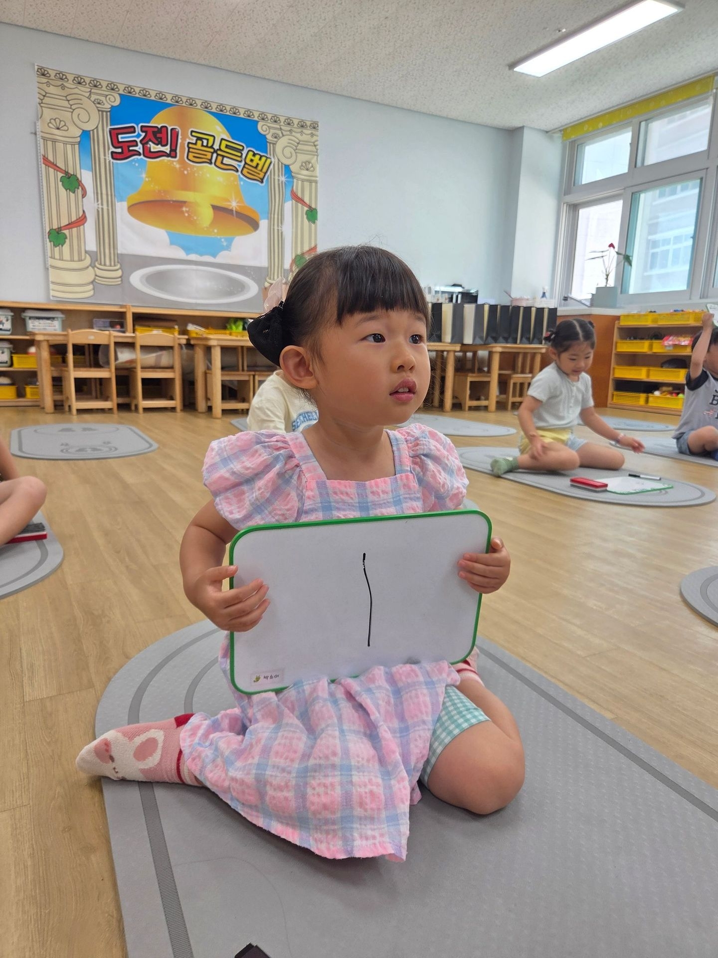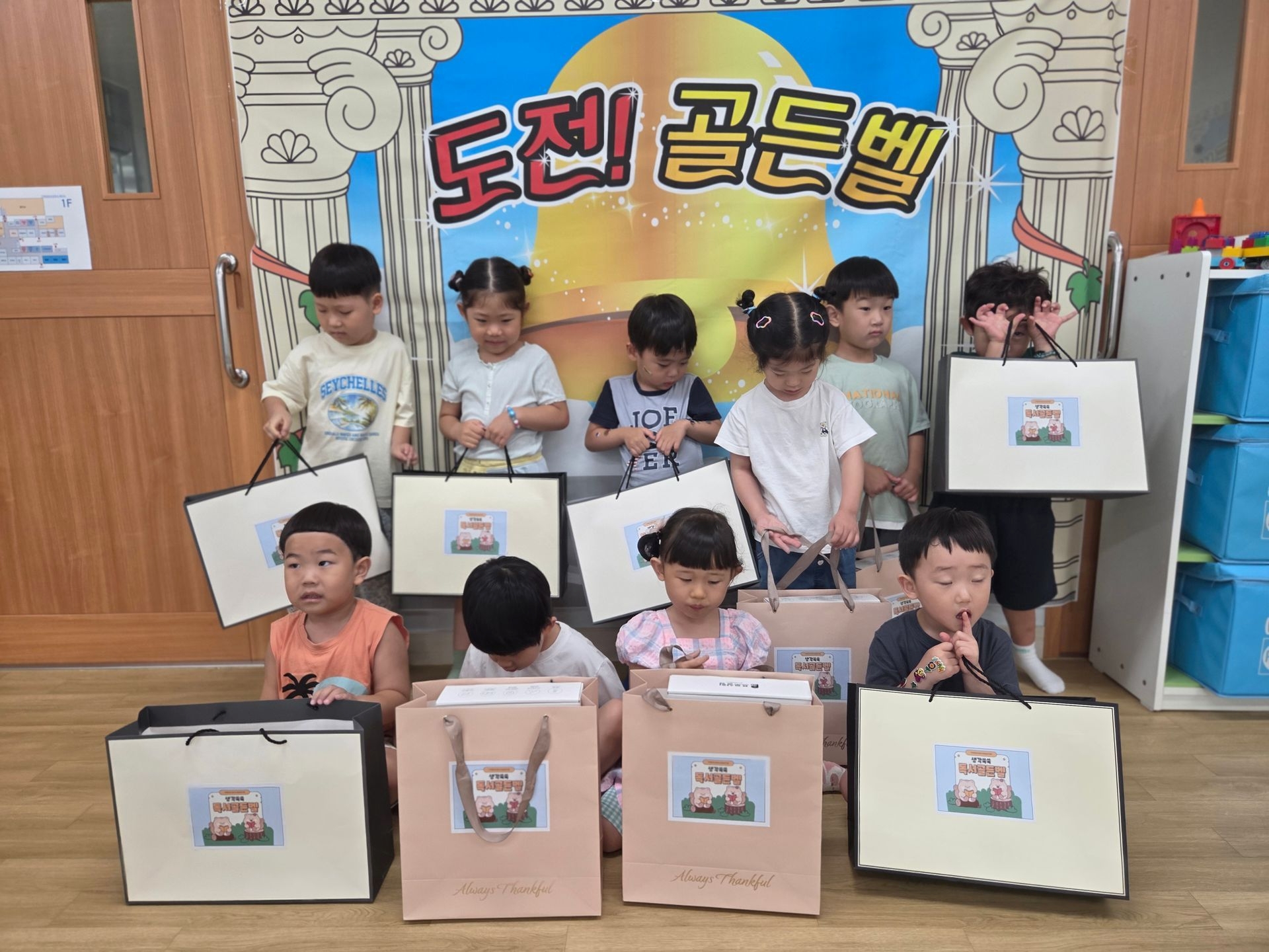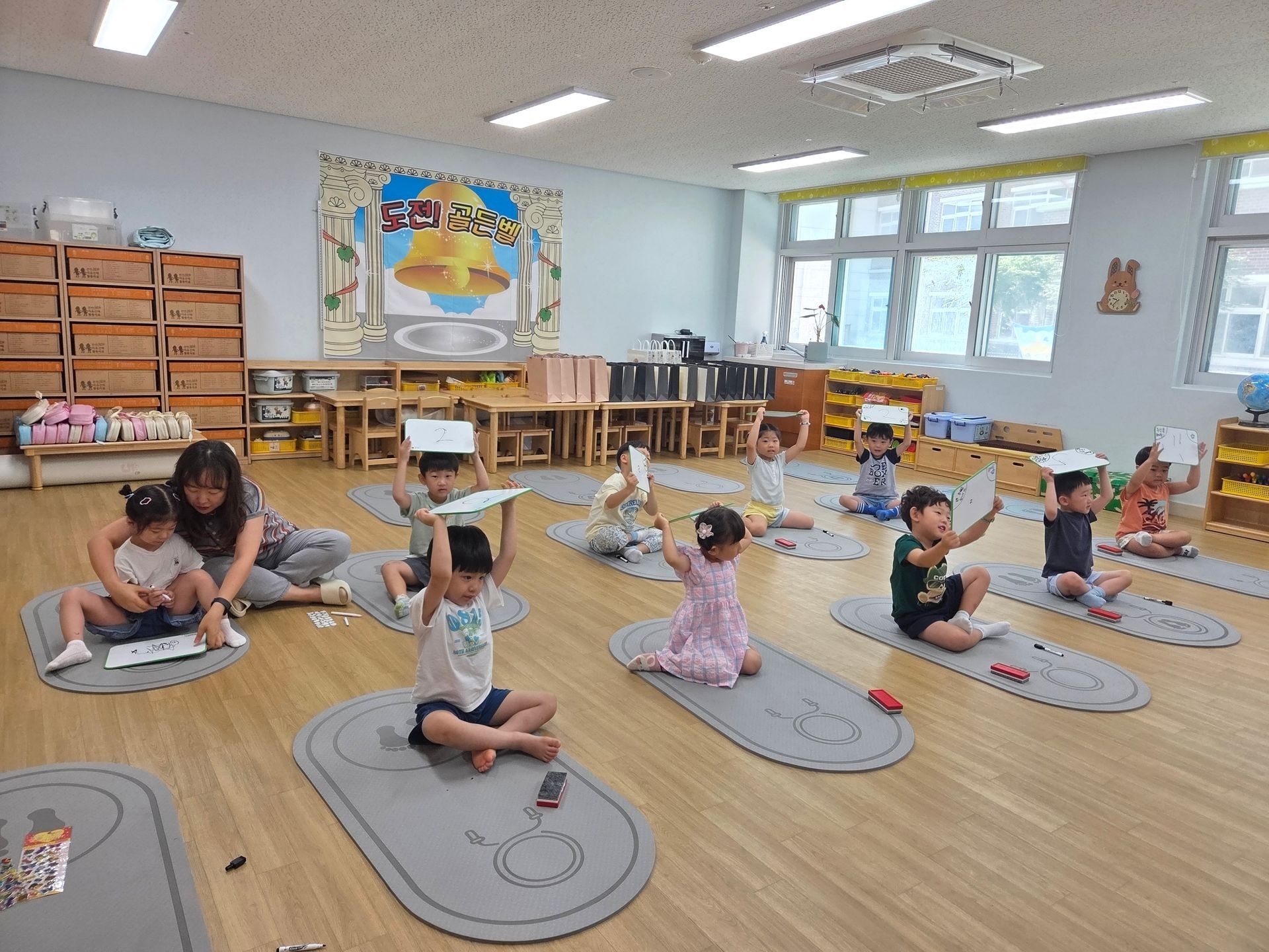 오늘 유치원에서는 ‘생각쑥쑥 독서골든벨’ 활동이 진행되었습니다. 아이들은 사전에 함께 읽고 익힌 책을 바탕으로 퀴즈를 풀며, 내용을 떠올리고 스스로 생각해보는 시간을 가졌답니다. 이번 '생각쑥쑥 독서 골든벨' 활동은 책의 내용을 되새기고 즐겁게 참여하는 경험 자체에 의미를 두고 진행되었습니다. 열심히 참여한 아이들을 격려하는 의미로 ‘독서대’를 선물로 전달하였으니, 가정에서도 아이가 책과 더욱 가까워질 수 있도록 따뜻한 응원 부탁드립니다.