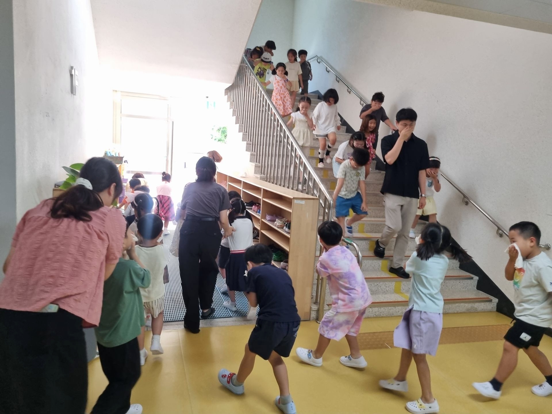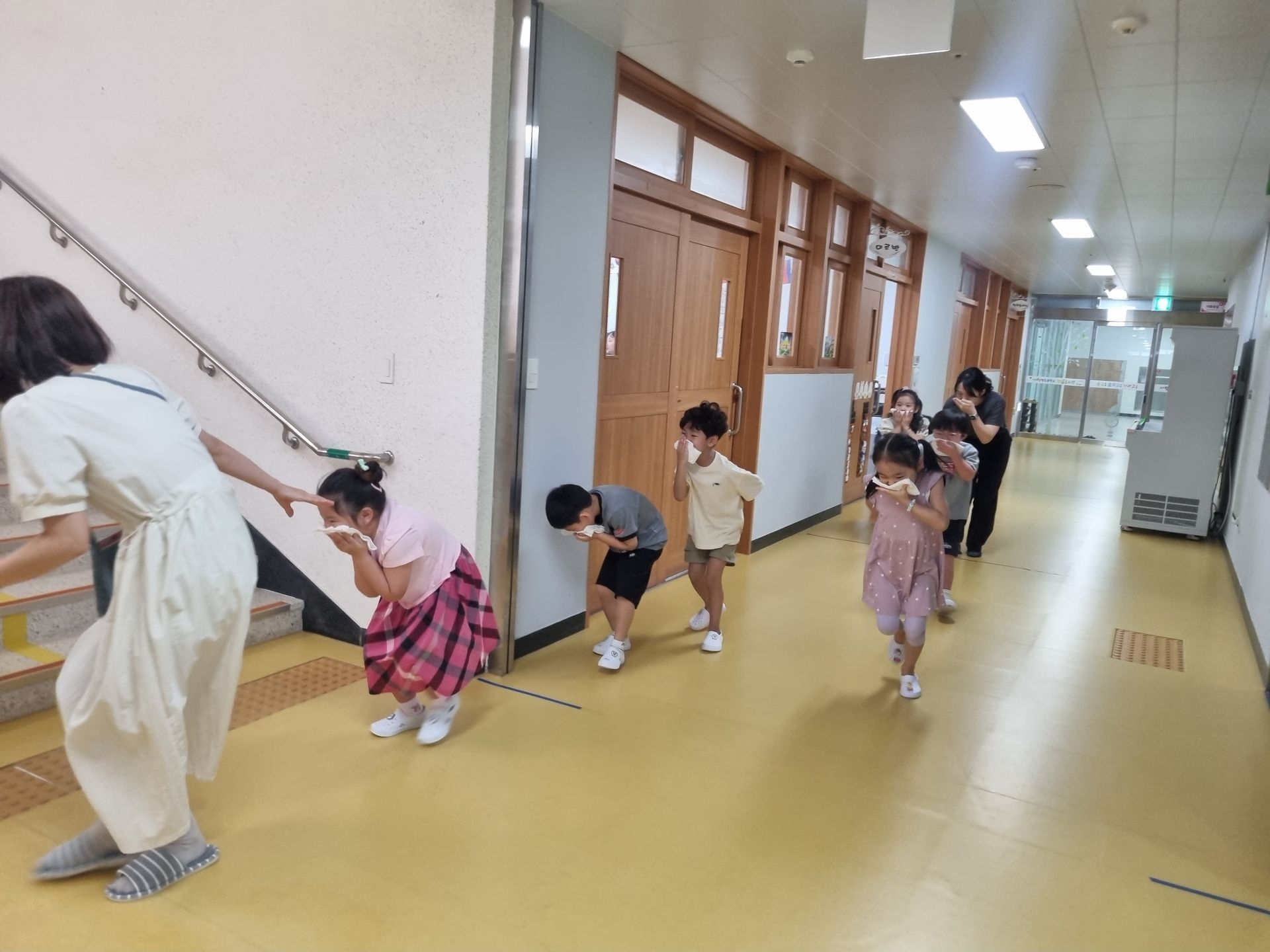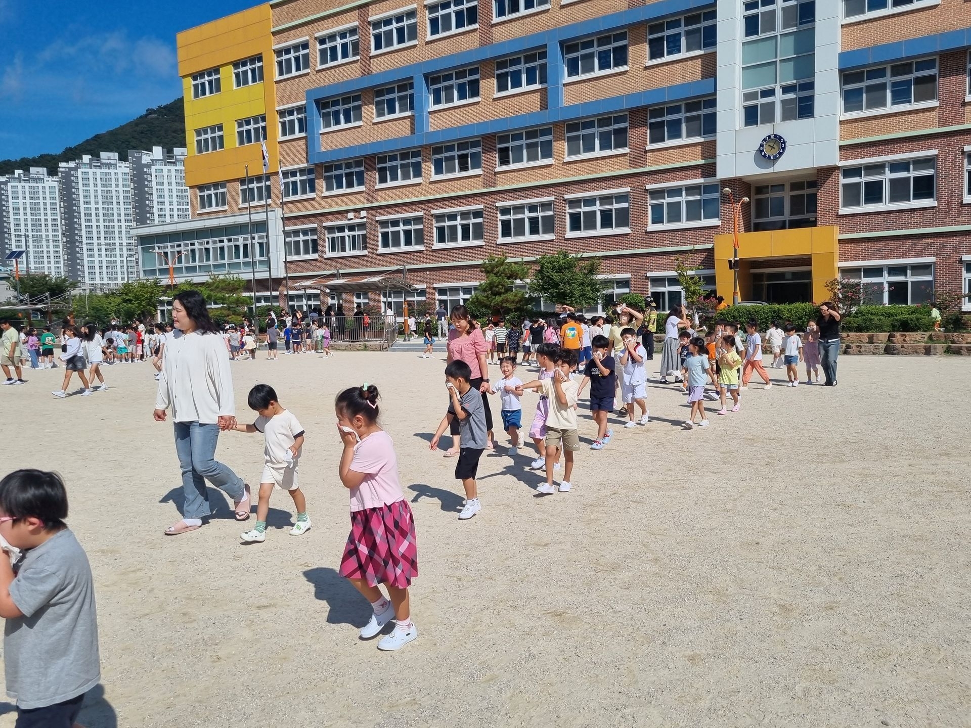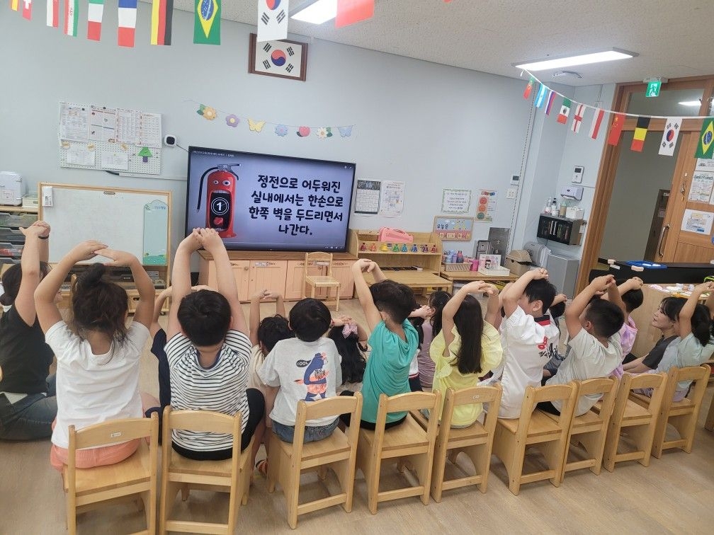 교실에서 미리 소방안전교육과 화재대피 O,X퀴즈를 실시하고 화재경보 사이렌 소리와 함께 신속하고 빠르게 운동장 으로 대피하였습니다.