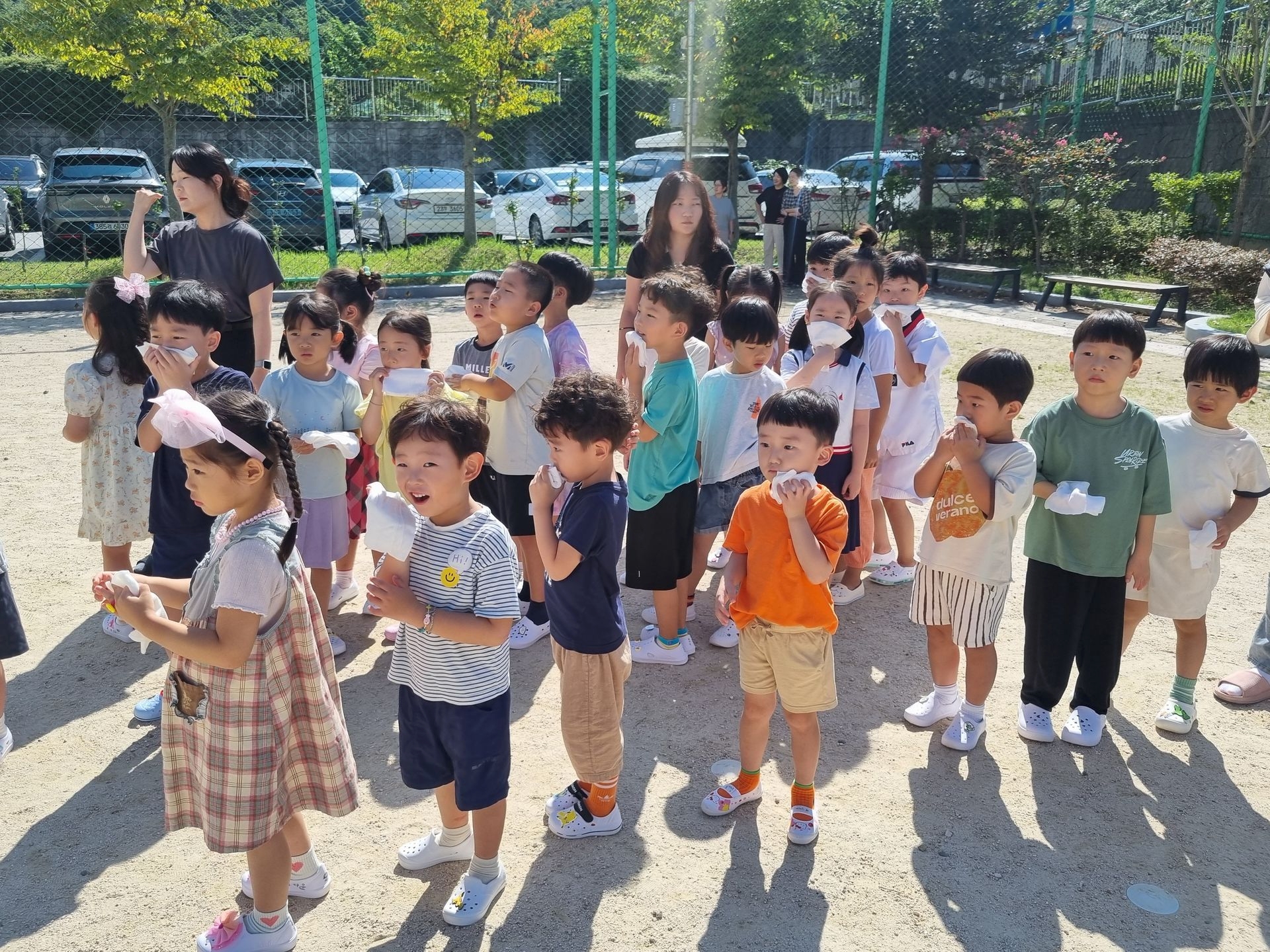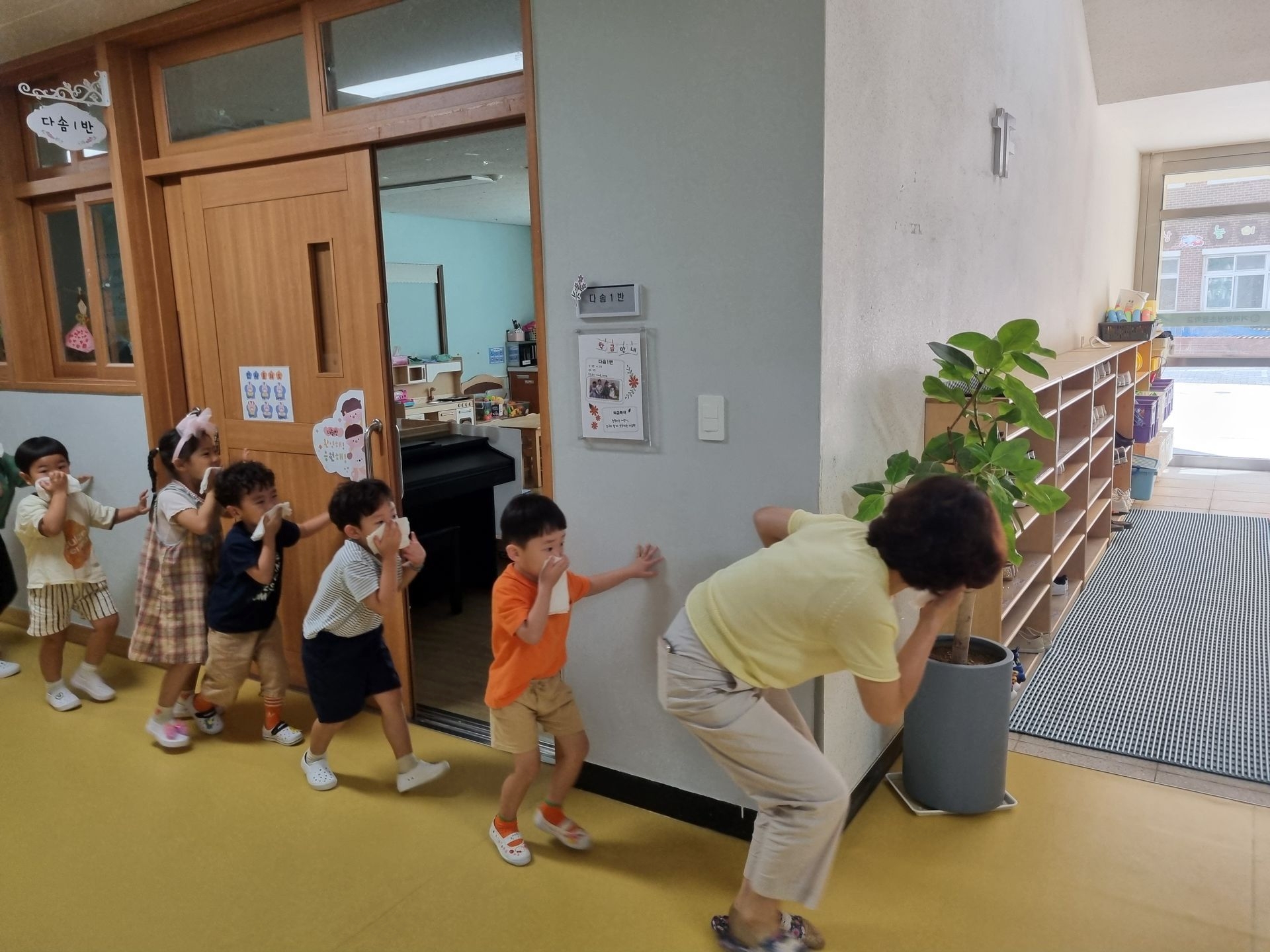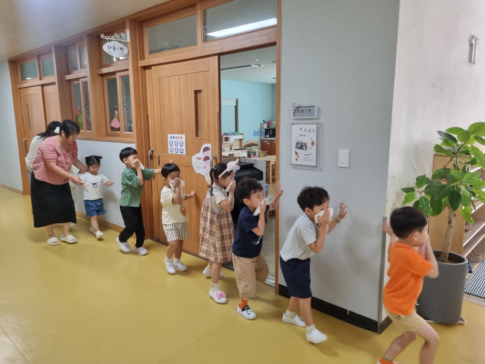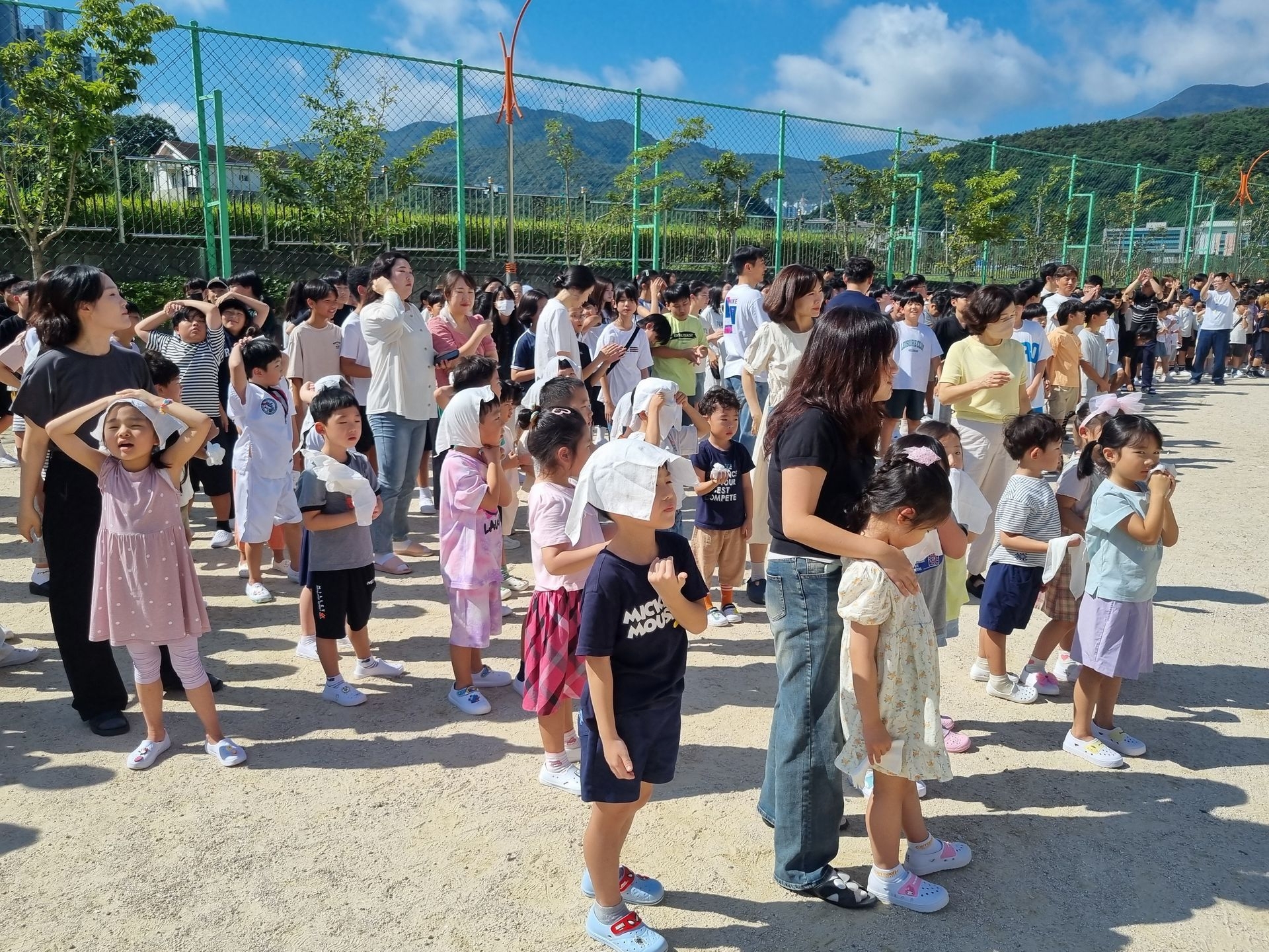 교실에서 미리 소방안전교육과 화재대피 O,X퀴즈를 실시하고 화재경보 사이렌 소리와 함께 신속하고 빠르게 운동장 으로 대피하였습니다.