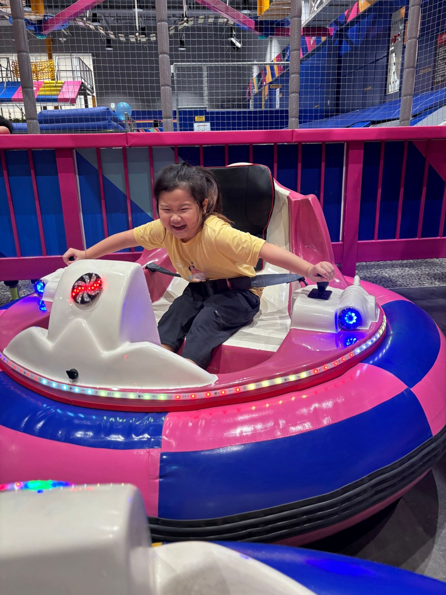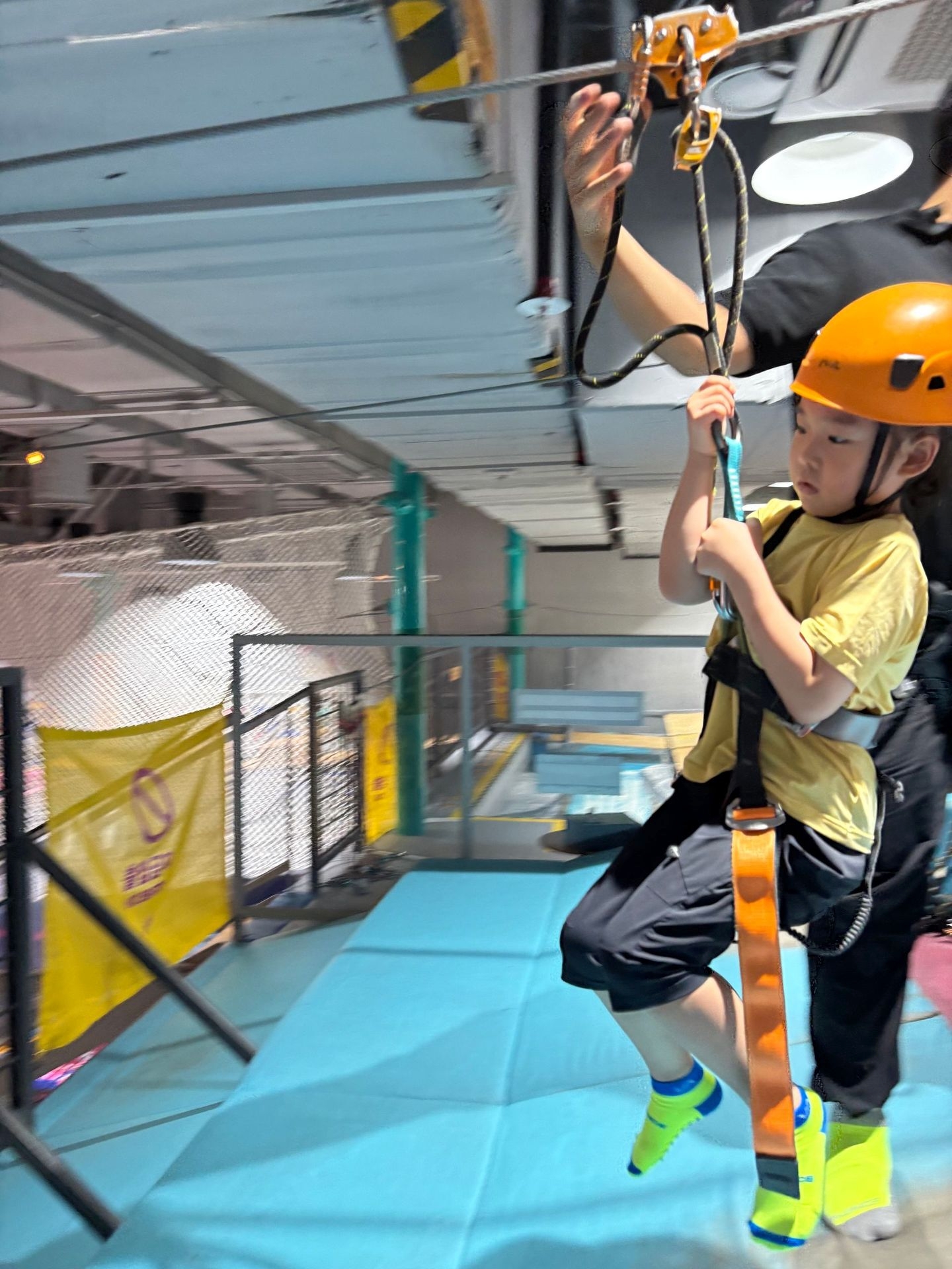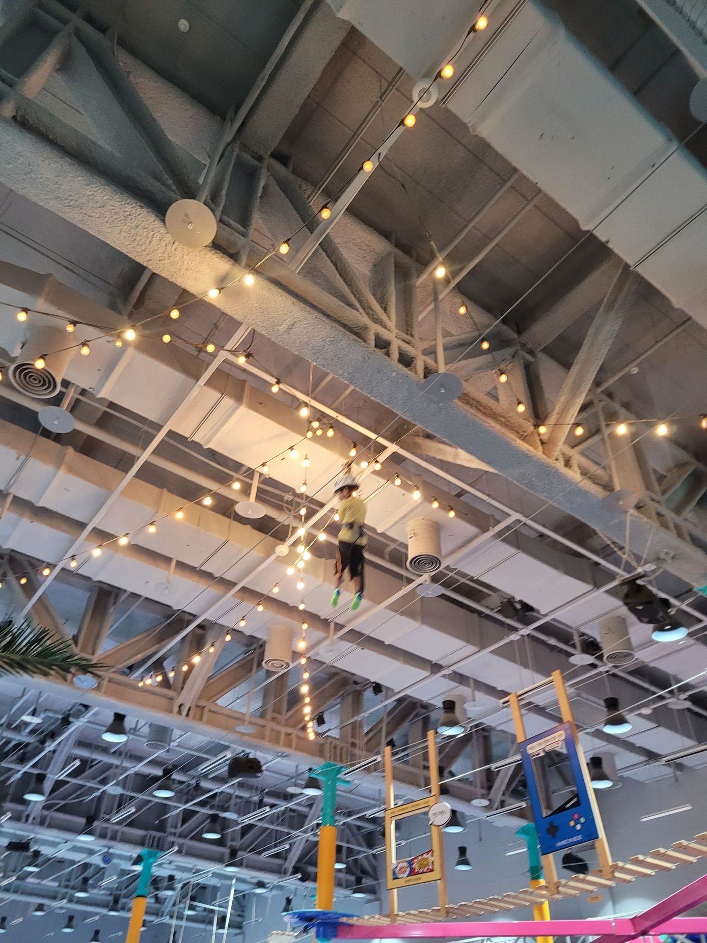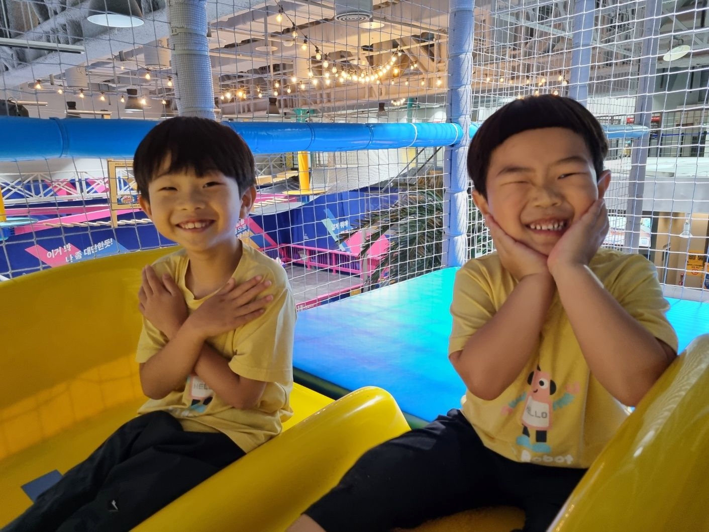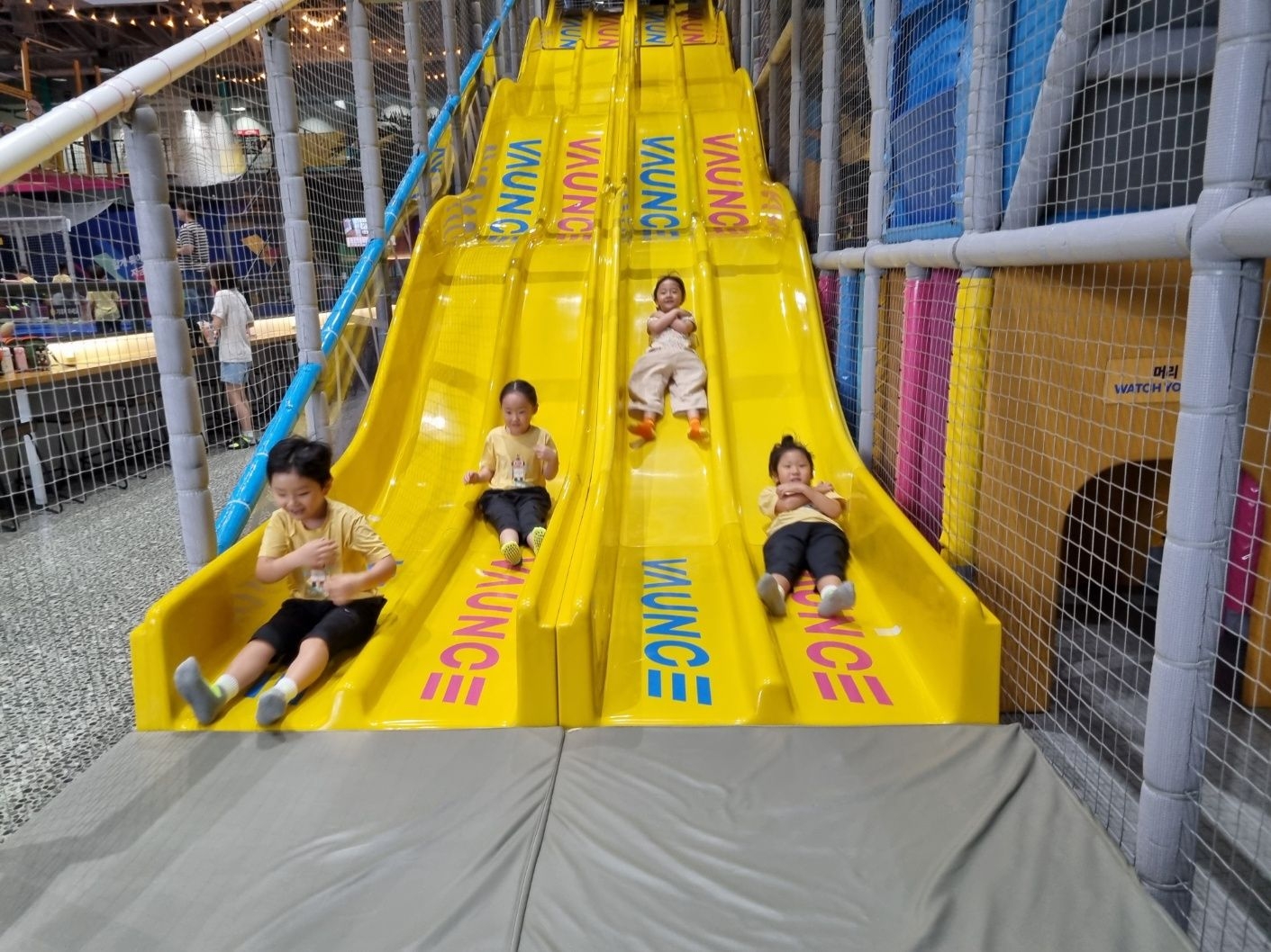 아이들이 트램폴린, 짚라인, 대형 미끄럼틀 등에서 마음껏 뛰어놀고,