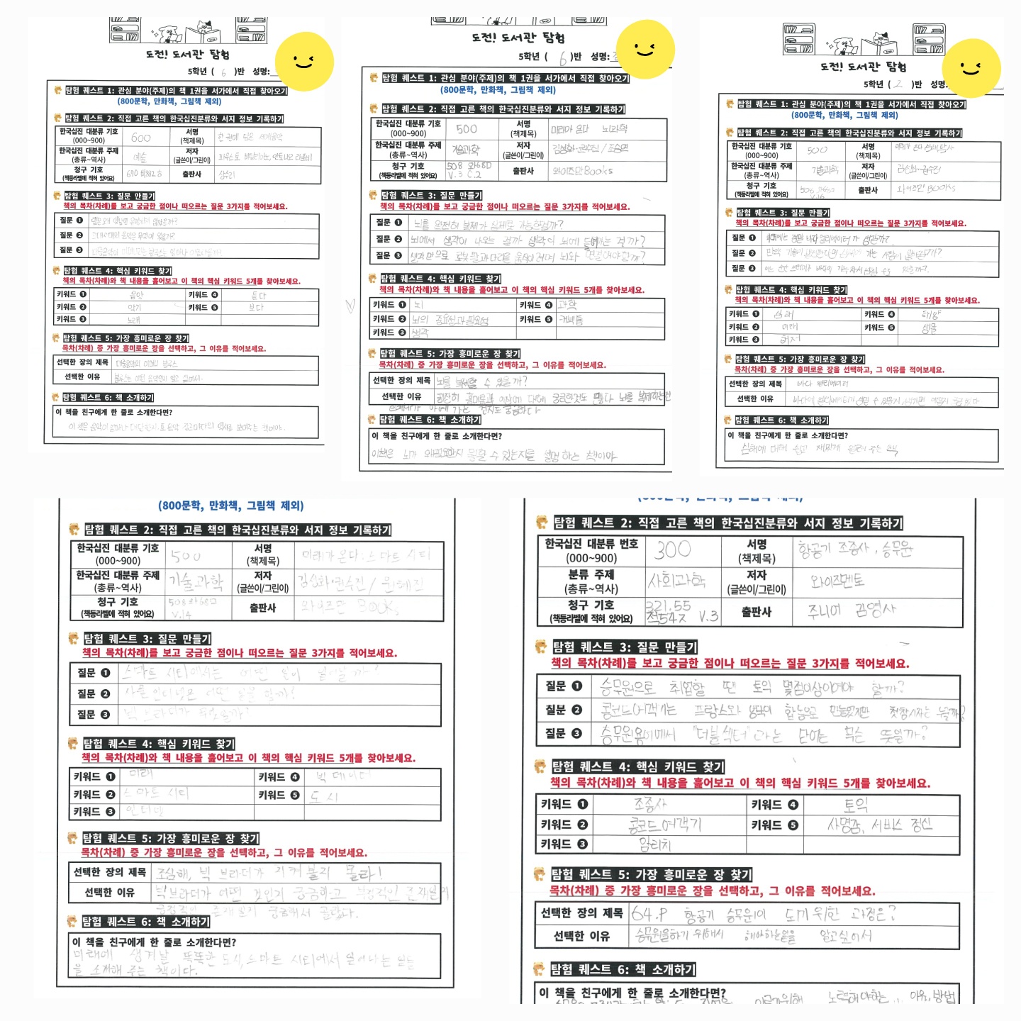 - 1차시: 책 탐색하기(서지사항, 한국십진분류주제, 청구기호, 목차 탐색을 기반으로 떠오르는 질문 적기, 책의 키워드 적기, 책 소개 한 줄 적기 등)