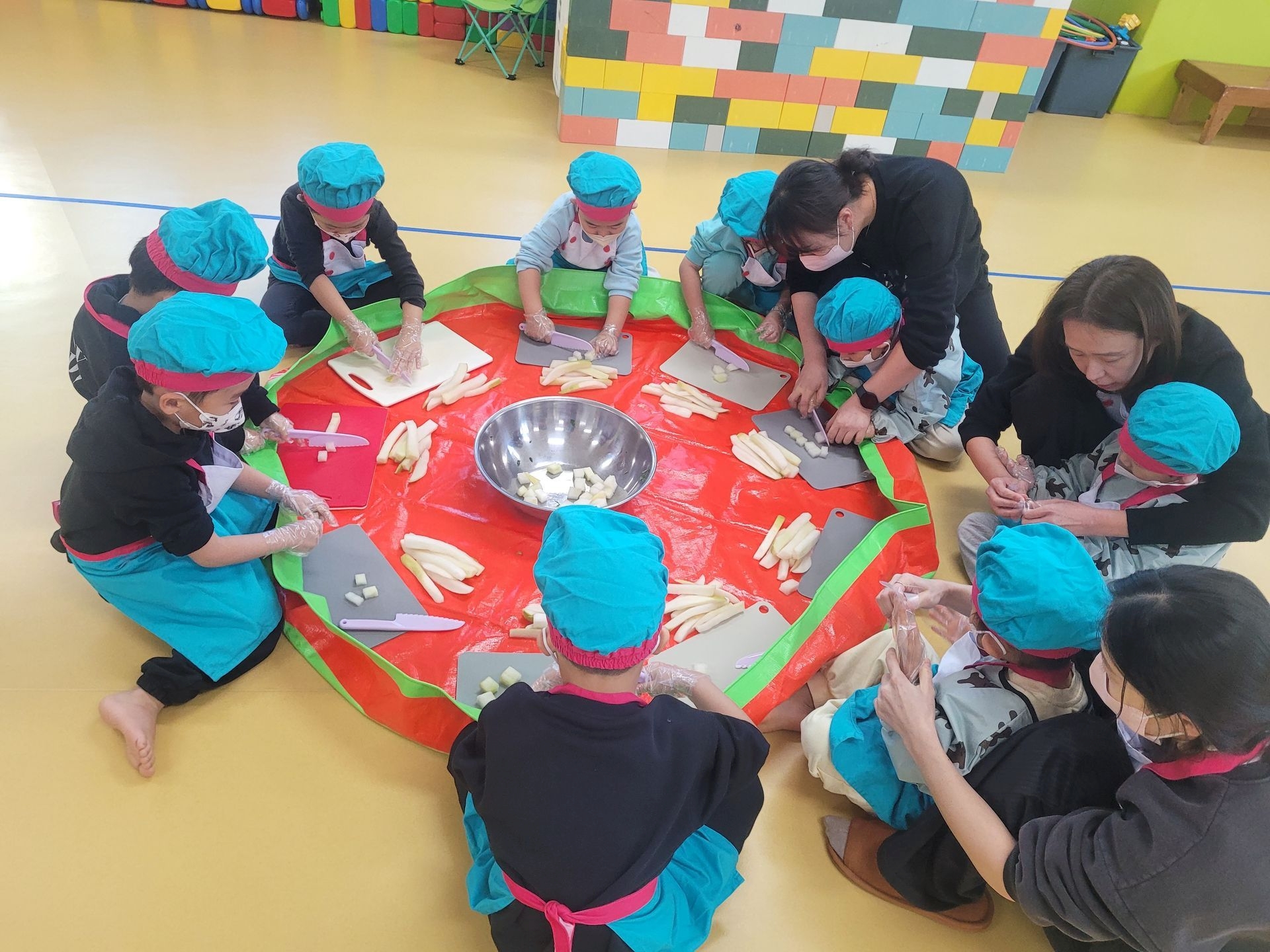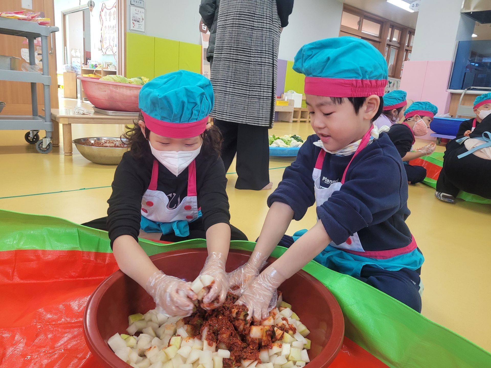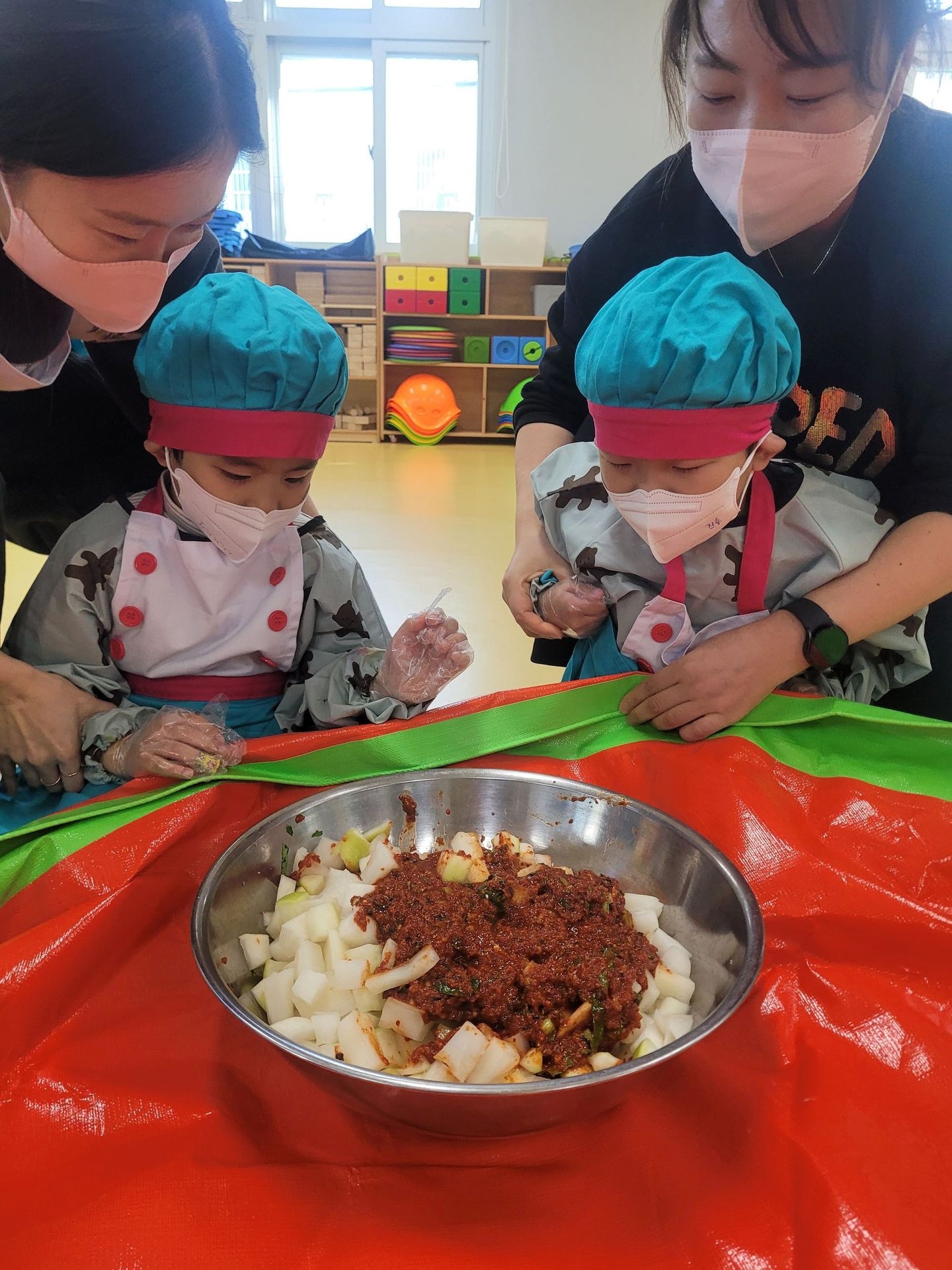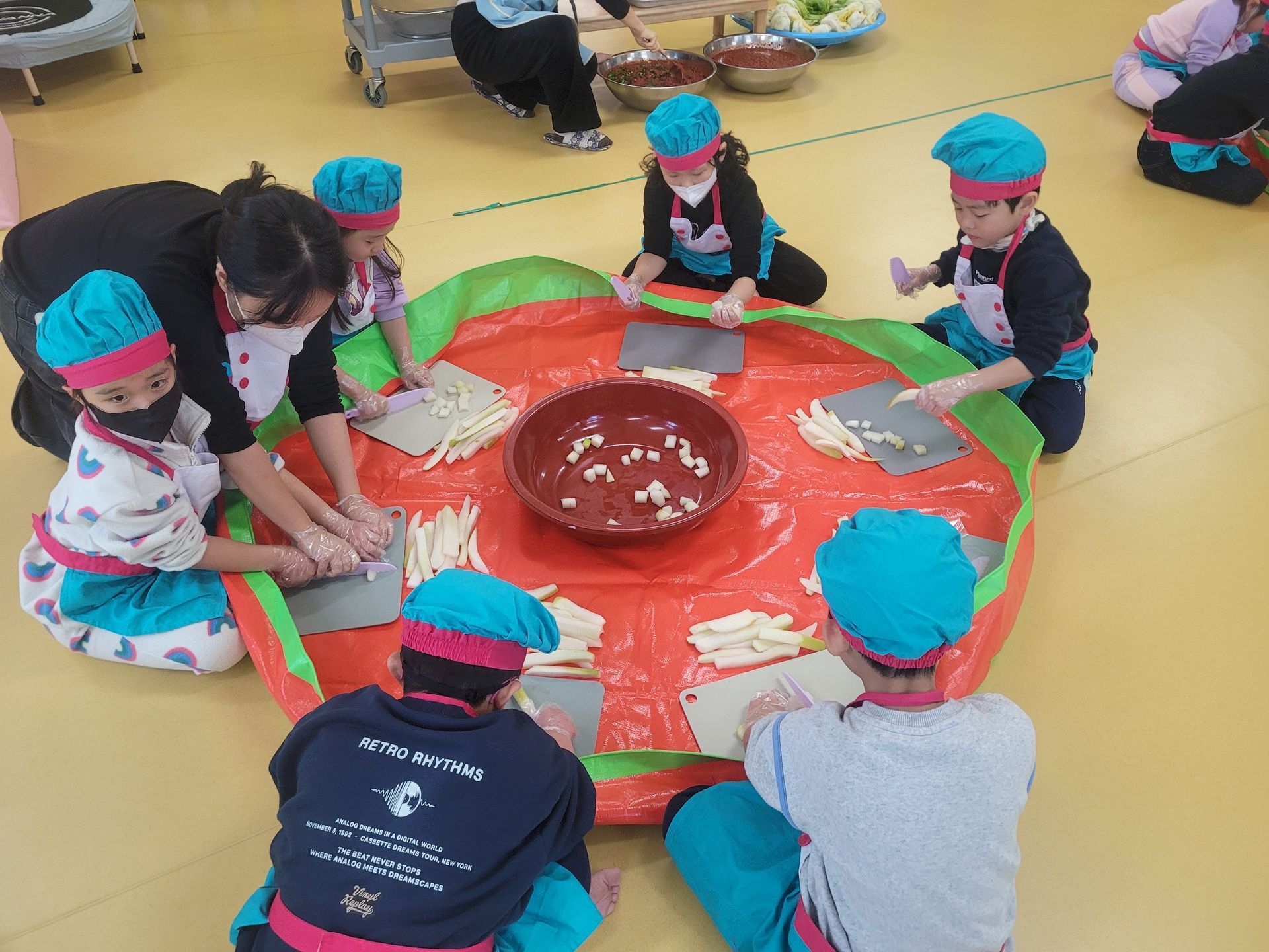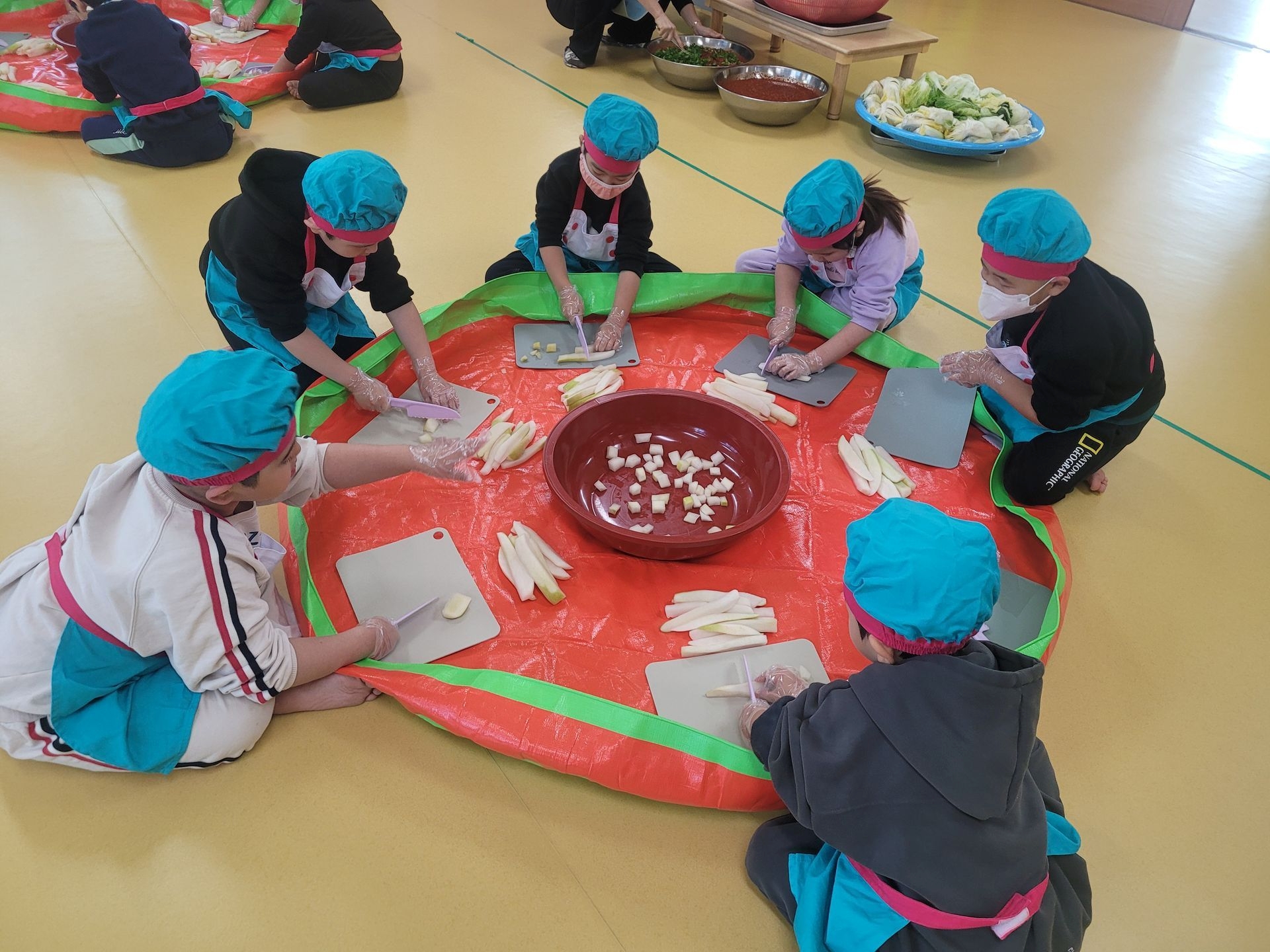 절여 놓은 무를 직접 썰어 깍두기를 만들어 보고, 배추에 김치소를 넣어 배추김치도 담가보았습니다. 이번 활동에 사용된 무와 배추는 아이들이 텃밭에서 직접 재배한 작물로, 더욱 뜻깊은 시간이었습니다.