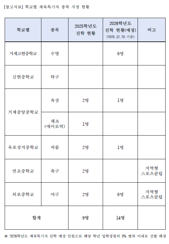 2026학년도 중학교 진학 체육특기자 재배정 선발 계획을 안내해 드립니다. -------------------- 가. 접수시간: 2026.1.8.(목)~1.14.(수) 나. 접수처: 거제교육지원청 평생체육과 -------------------- 본 재배정은 2026.1.5.(월) 중학교 배정 발표 이후 실시됩니다. 신청을 희망하는 학생은 해당 내용을 중학 배정 발표 전 각 담임과 미리 상담하시길 바라며, 기한 내 필요 서류를 준비하여 신청할 수 있도록 하시길 바랍니다.